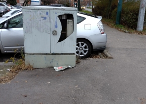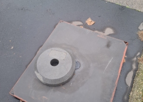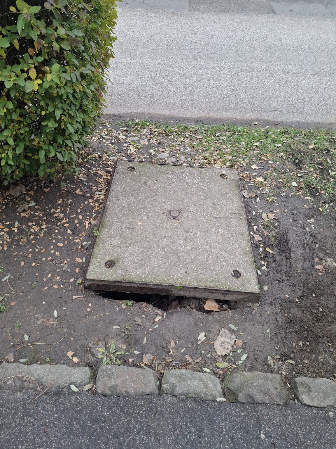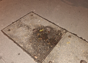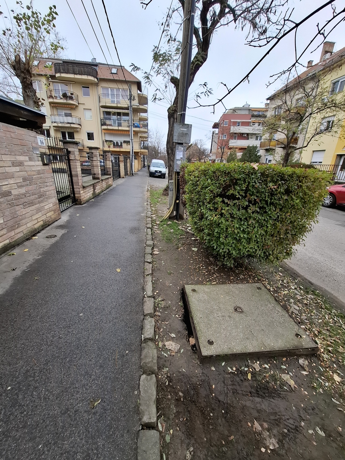A Jávorka Ádám 16 előtt a közműaknának nem lett kialakítva megfelelő perem, így egy nagy rés tátong a szélén.