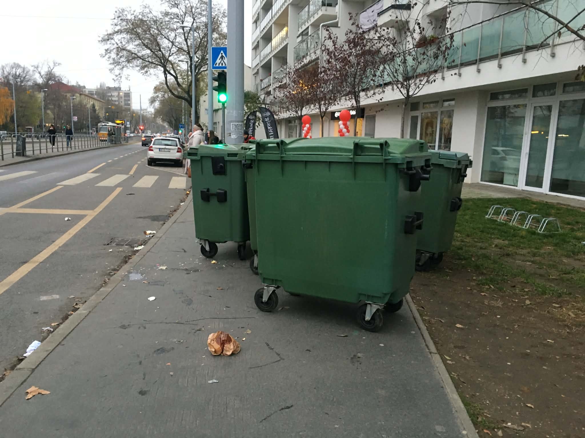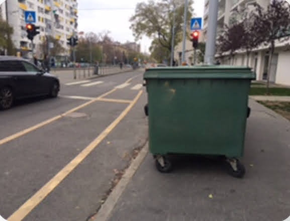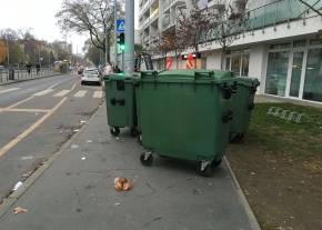 Kérem járjanak utána, hogy mennyiben felel meg a jogszabálynak a XI.kerületi Semiramis Garden lakóparkhoz tartozó 3-4db nagy méretű szeméttároló elhelyezése a Fehérvári út 154-160. magasságában a járdafelületen úgy, hogy a zebrától kb.3-4m-re helyezik ki őket a 10méterre lévő szeméttárolóból kitolva 3x egy héten (vasárnap-kedd-csütörtök este, h másnap reggel el tudják szállítani). Emiatt - reggelente főleg,de máskor sem - a gyalogosok nem látják a balról érkező járműveket átkelésnél, tehát balesetveszélyes. Nem tudom biztosított-e a jogszabályban meghatározott 0,75–1,5 m széles járdafelület mögöttük, figyelemmel a mozgáskorlátozottakra és babakocsisokra, valamint az utána járdán hagyott szemét is aggályos. A napokban az egyik nagy szemméttel megrakott monstrum legurult a járdáról, ez is balesetveszélyes az érkező/álló autósoknak/bicikliseknek és annak is, akire épp ráesik.