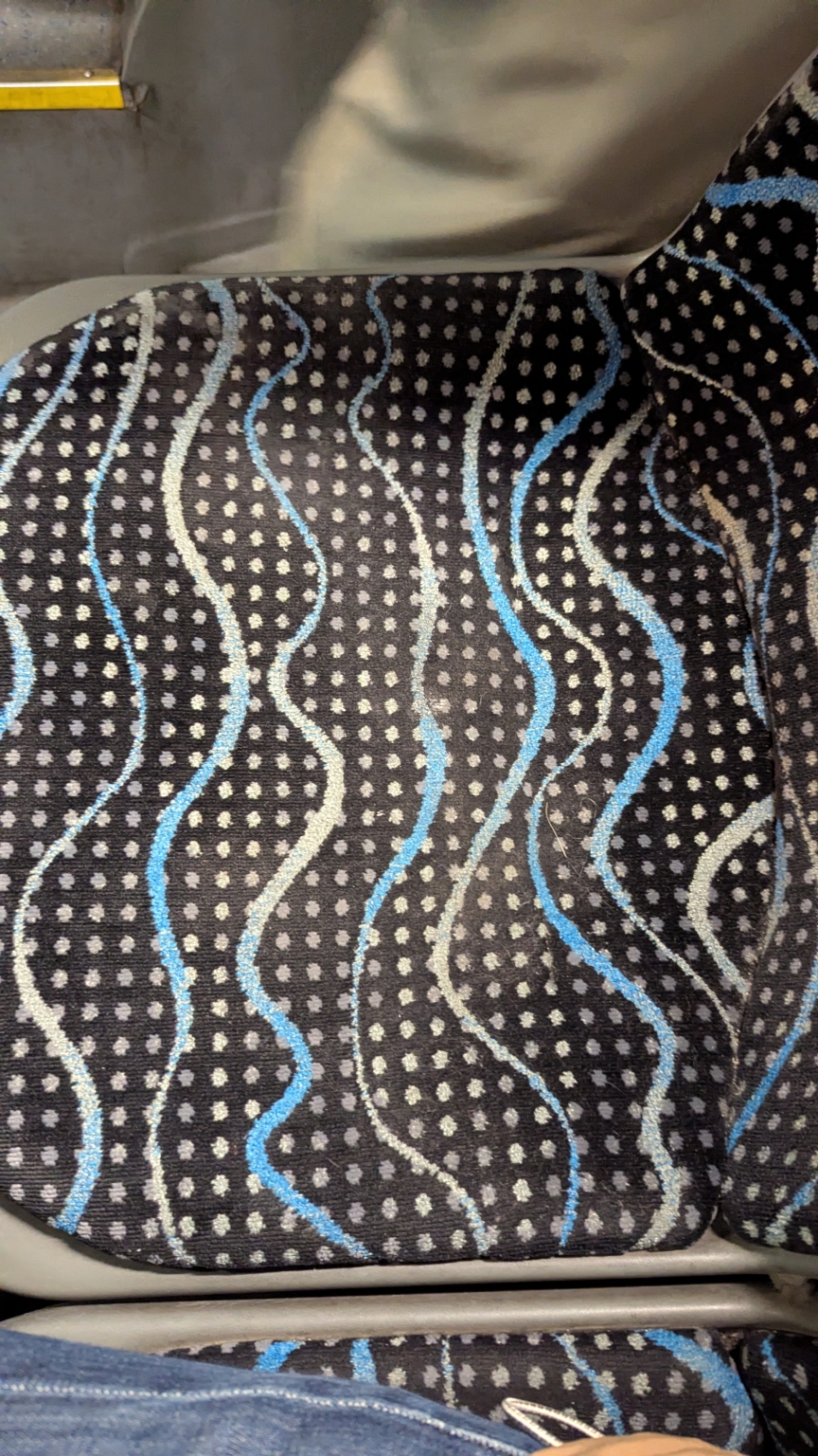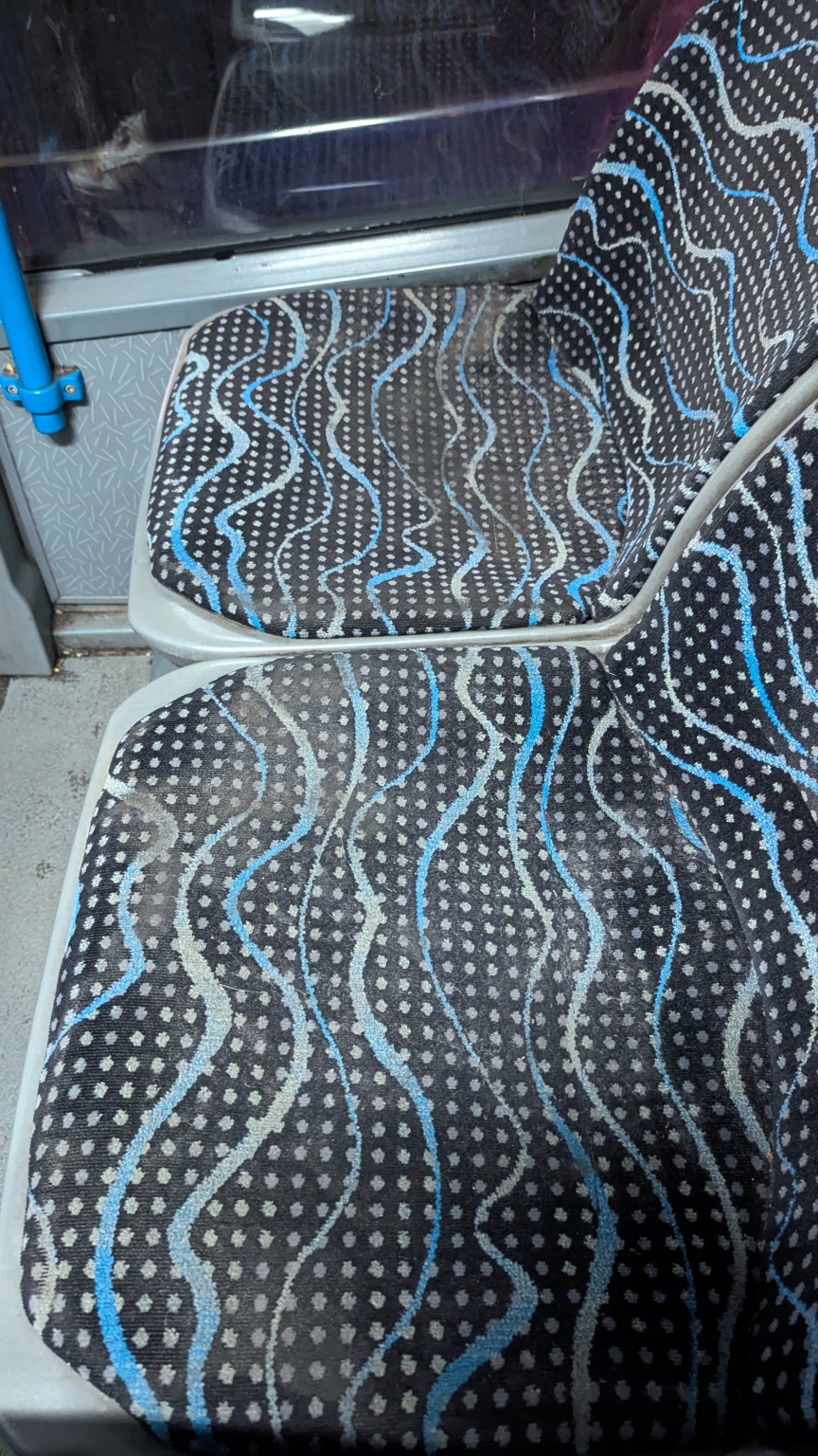 A PDB-703-as busz üléskárpitjai AZONNALI mélytisztításra szorulnak. Nem sok gusztusa van az embernek rájuk ülni. A fotók a hátsó traktus több helyén készültek.