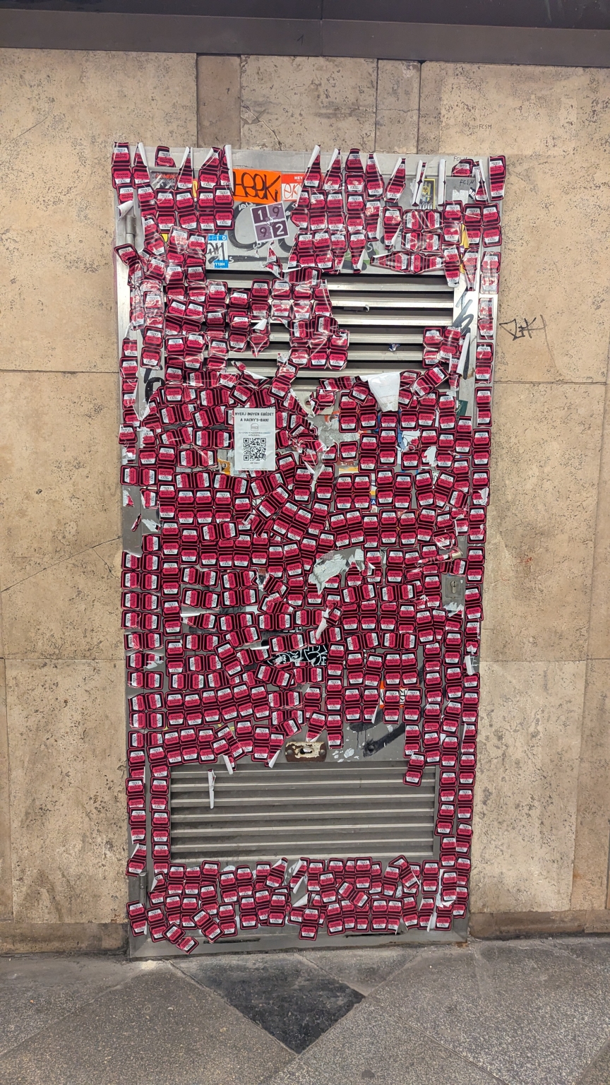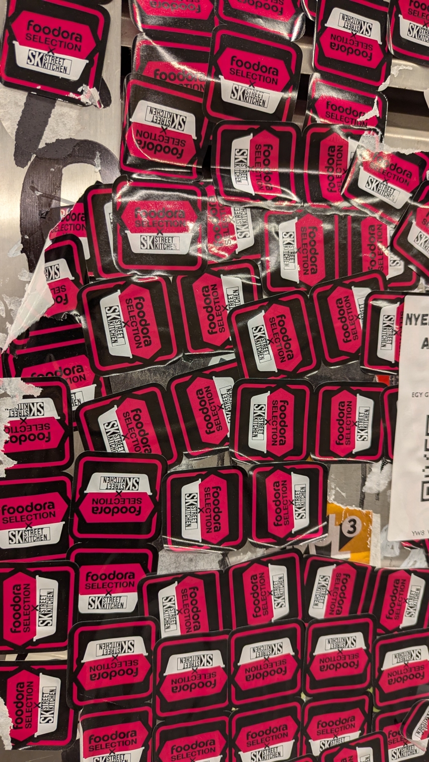 Az Astoria aluljáró egyik szellőzőjét ragasztották telibe Foodora x Streetkitchen apró matricákkal.