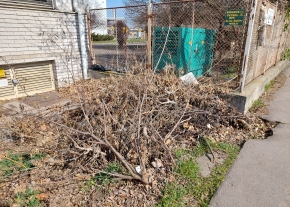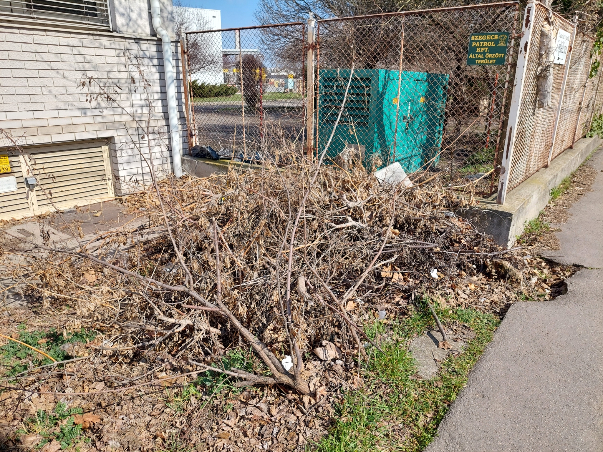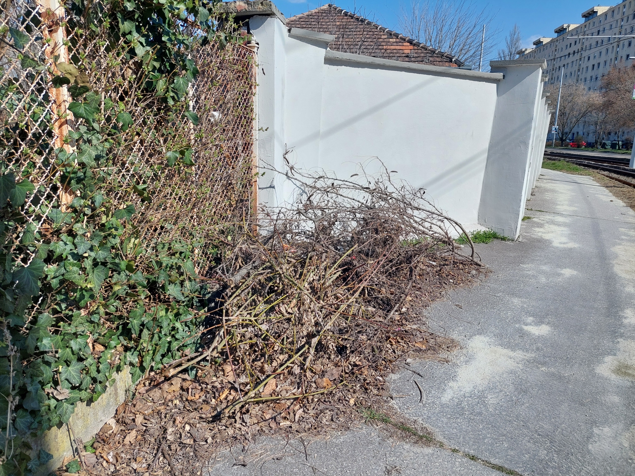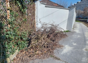 A kerítés mellett a lenyesett, elszáradt fagallyak nem kerültek elszállításra. Szükséges volna a terület rendbetétele.