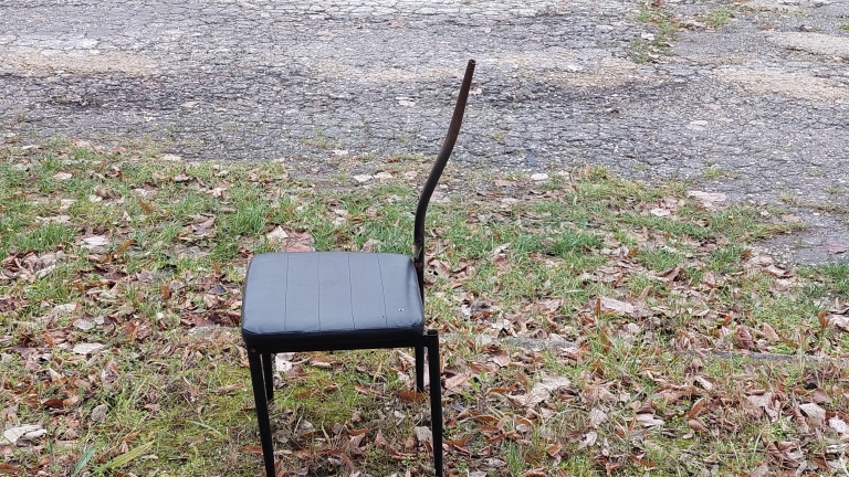 A járdaszakasz szemetes, kidobott szék, törmelék a járda mellett. Takarítás szükséges.