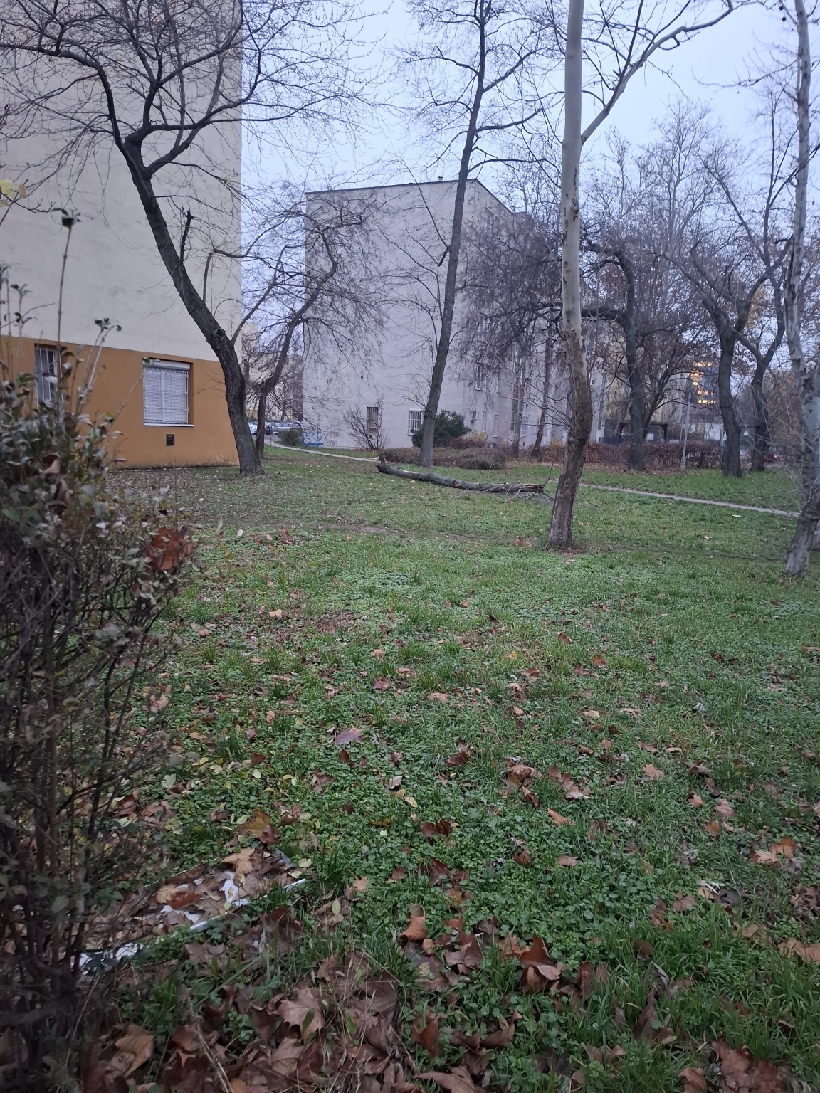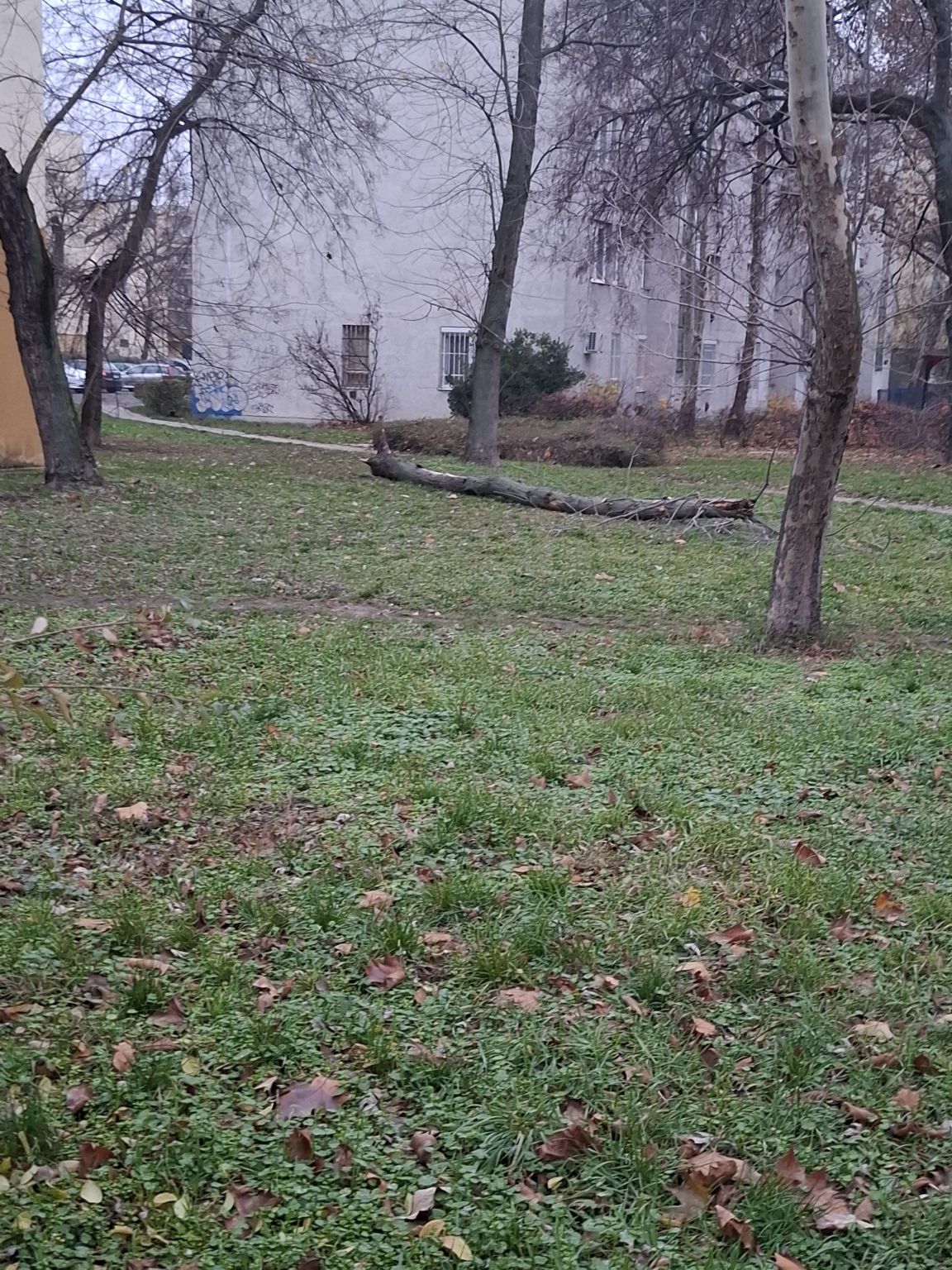 Az Egressy út 82 alatti társasház mellett van egy nagy kidőlt fa.