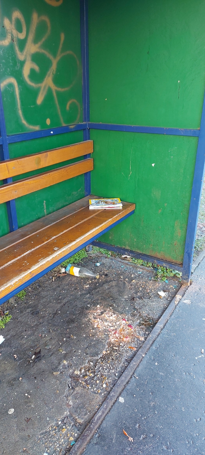 Most nem csináltam képet (ez még egy régebbi) mert undorító. A hányás a megálló Ananász utcai végében, a kresztábla aljában, a széklet zsebkendővel pedig közvetlen a megálló fedett részében található.