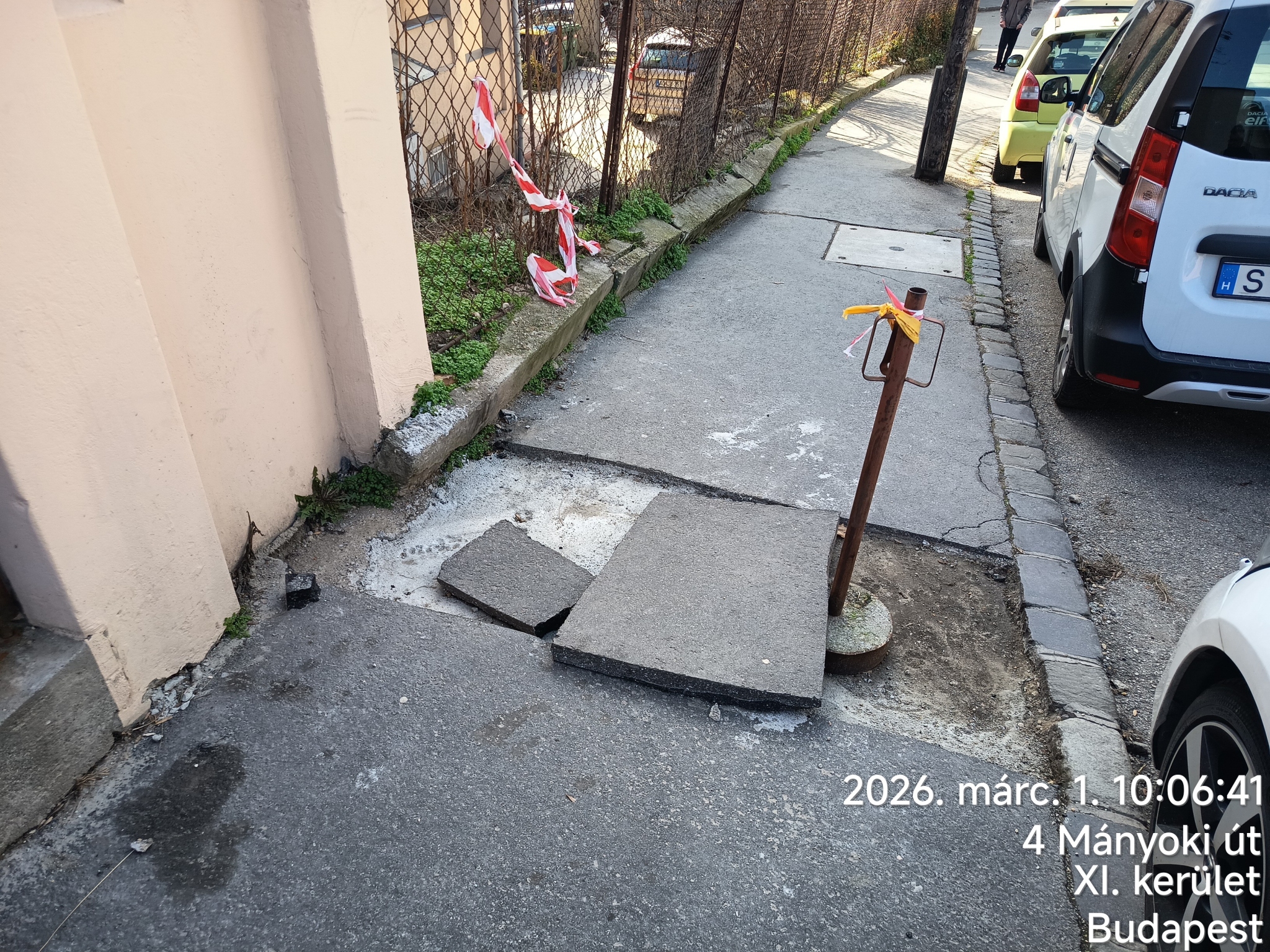 Valamilyen művelet miatt a Mányoki úton a járdát egy pár m2 területen felbontották, és utána úgyhagyták. A bizonytalanabb gyalogosok ibkább kimennek az útra, akár a parkoló autót megkerülve is. A járdát javítsák ki, ha még nem lehet, akkor addig a mellette lévő parkolóhelyen alakítsanak ki kerülő útvonalat!
