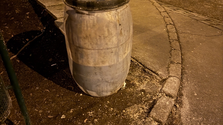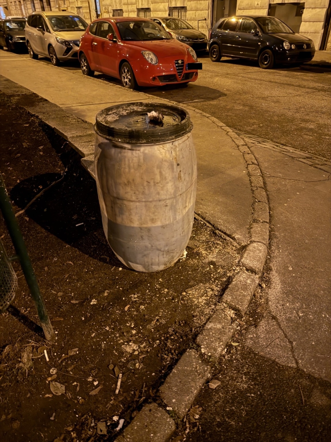 A Budapest IX. ker. Mihálkovics utca 16. számmal szemben, második hete egy hordó van a szemetes mellett.