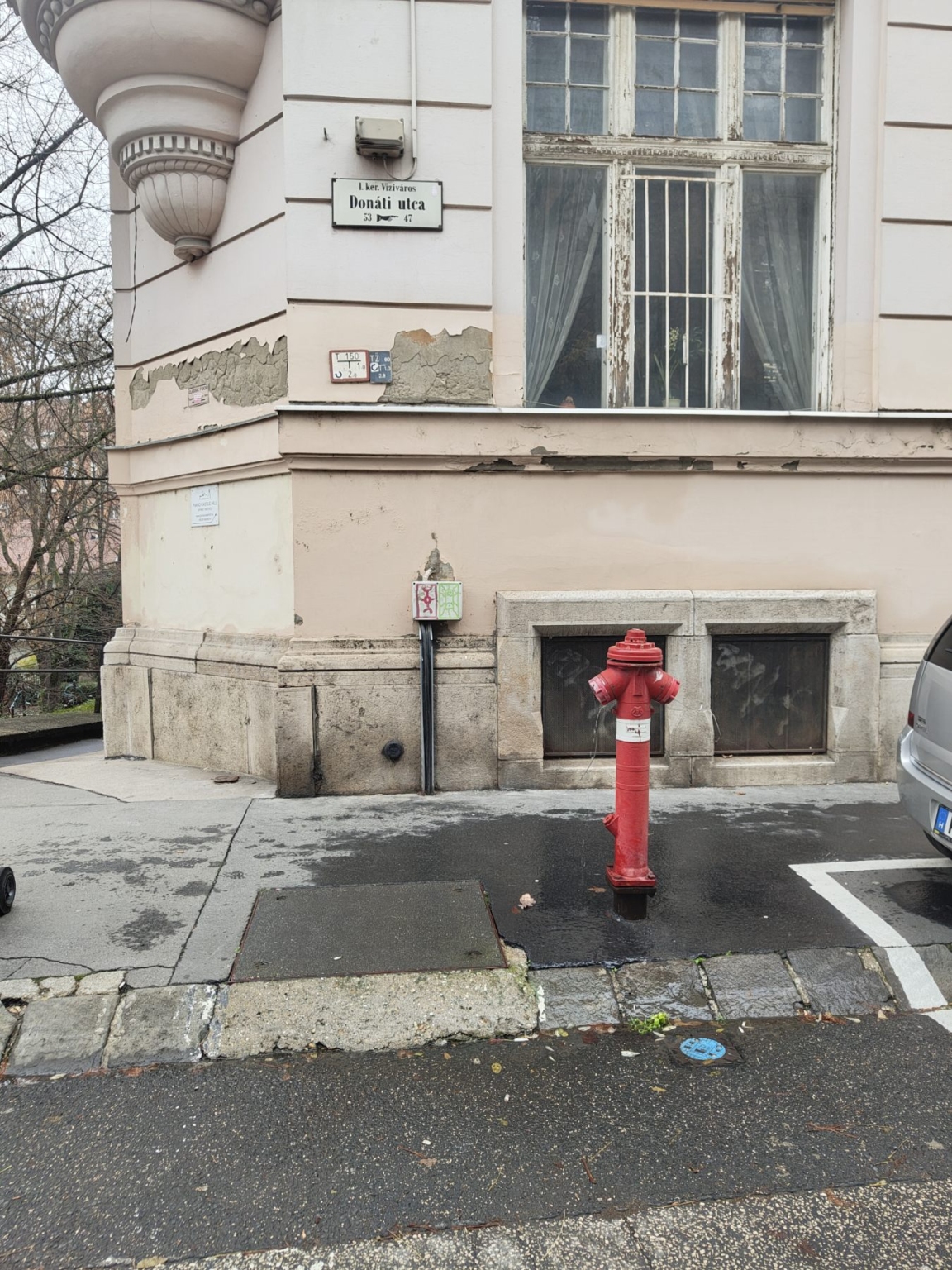 A Donáti utcában a képen látható tűzcsap folyik. Intézkedésüket köszönöm!