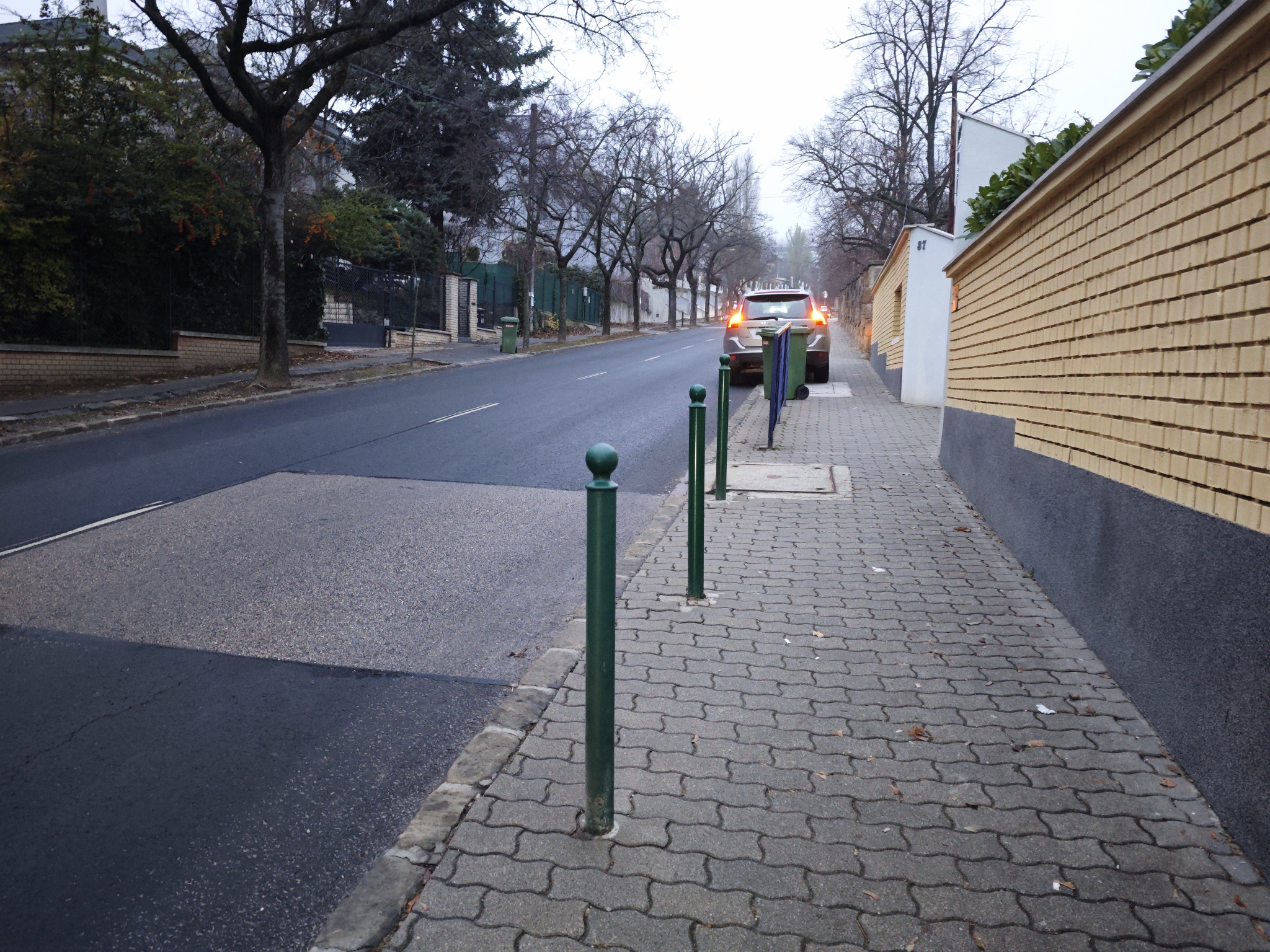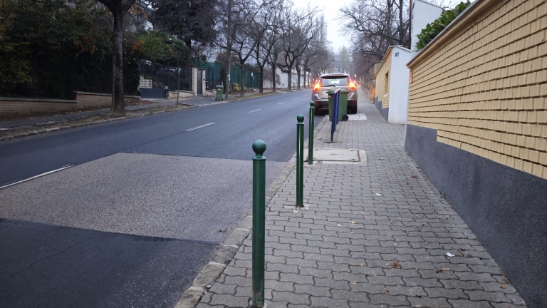 Fél éve egy balesetben letarolták a pollereket és a korlátot is. Most a pollerek helyére, a járdára parkolnak az Osztrák ovinál