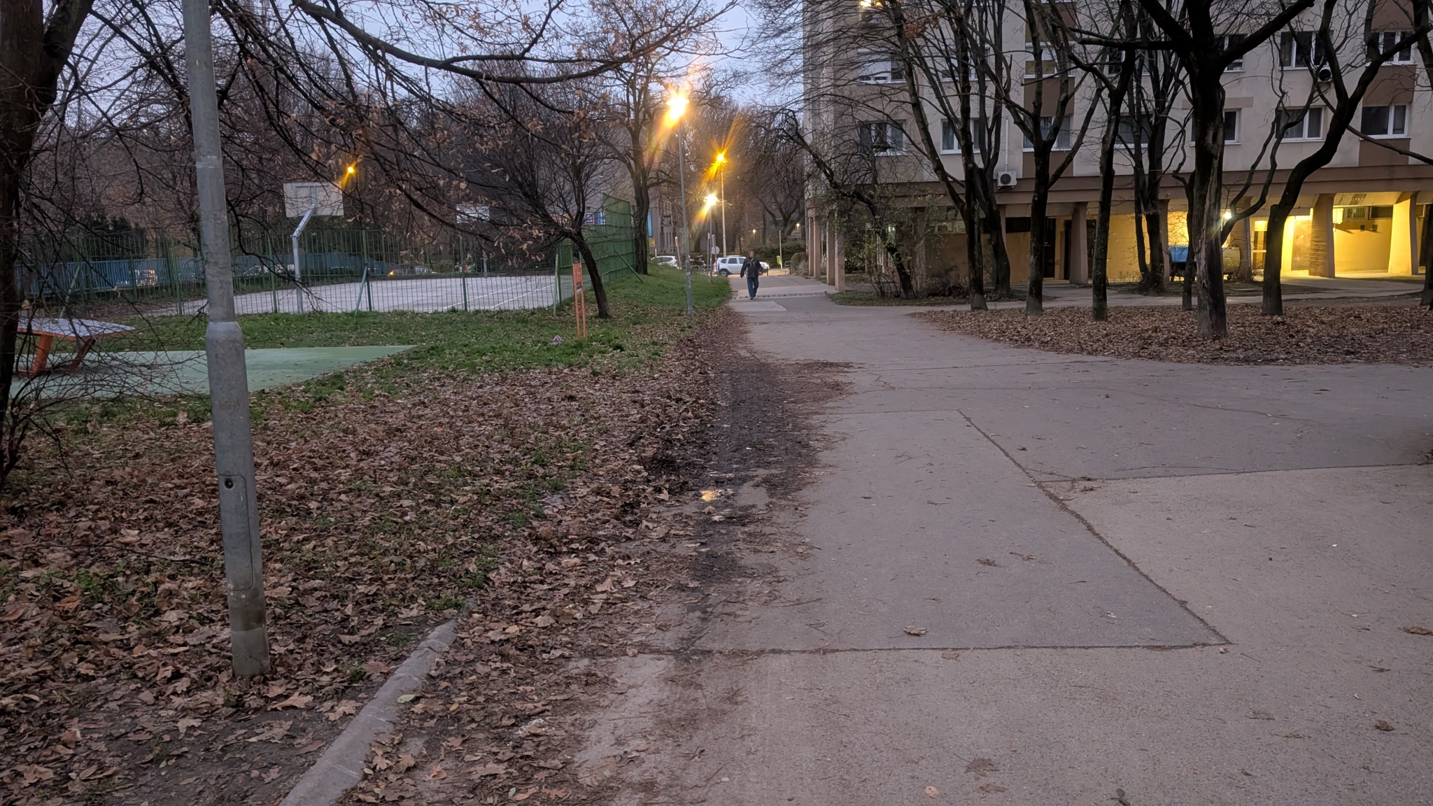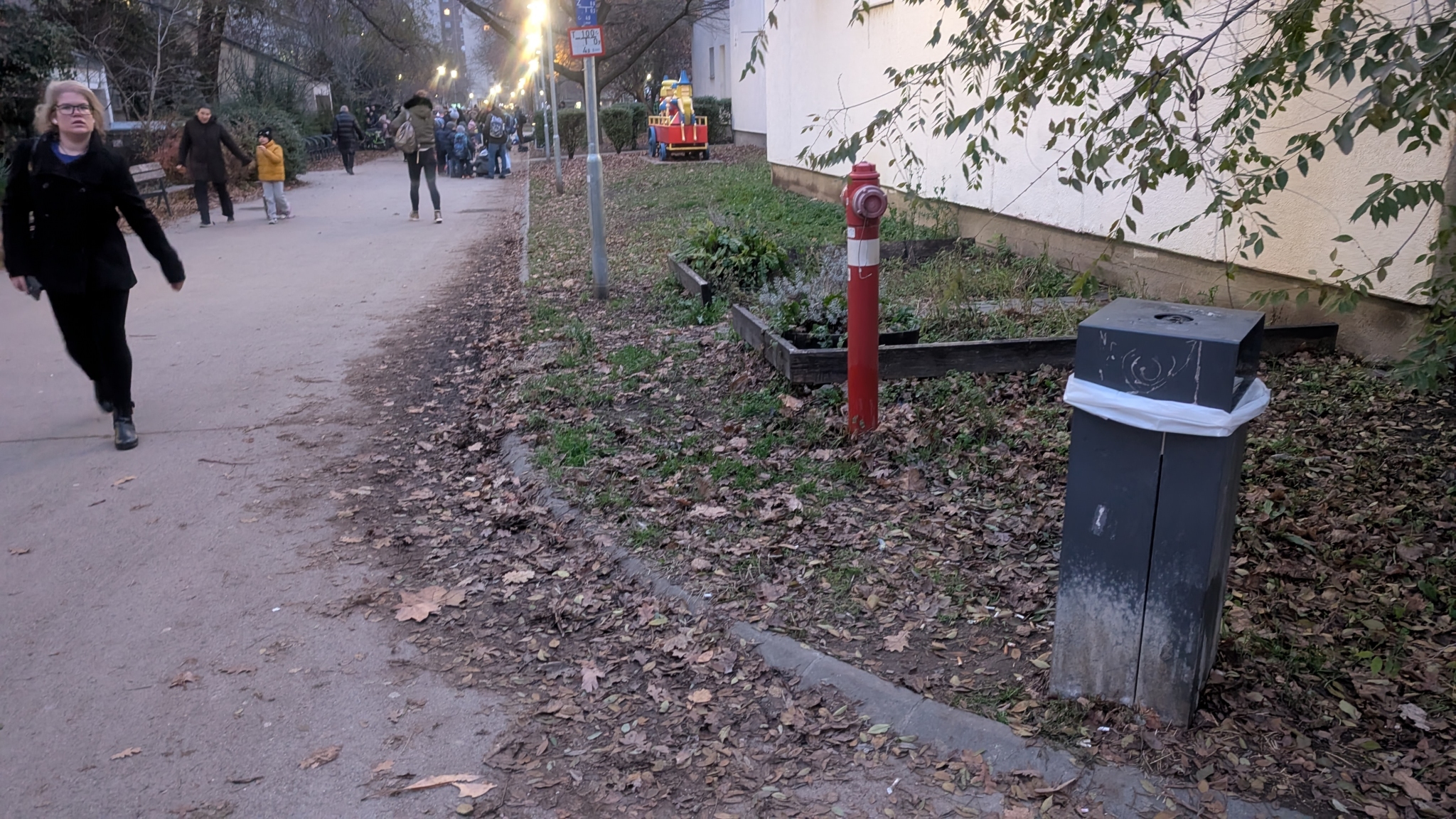 A Váradi utca felől az Óbudai Nagy László iskolához vezető járdán az orvosi rendelőnél két helyen is csúszós massza alakult ki falevelekből. Évente visszatérő probléma, hogy nem takarítják fel rendesen a leveleket, és azok így leszűkítik a járdát, a balesetveszély miatt senki nem akar a dagonyában menni.