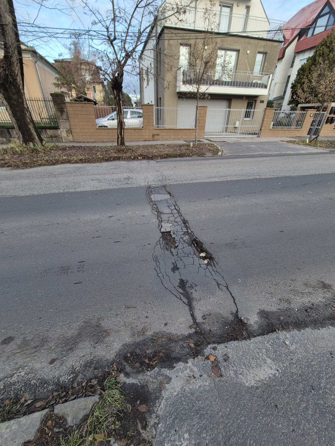 Egy méretes kátyú keletkezett a Szugló utcában a Cinkotai út irányában. Troli is jár a vonalon, a ház falak remegnek, ahogy áthajtanak a kátyún.