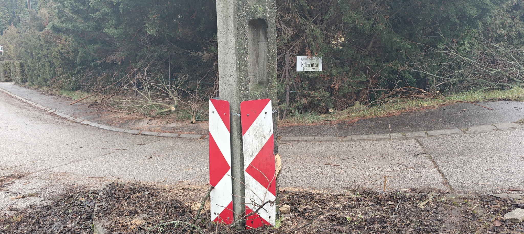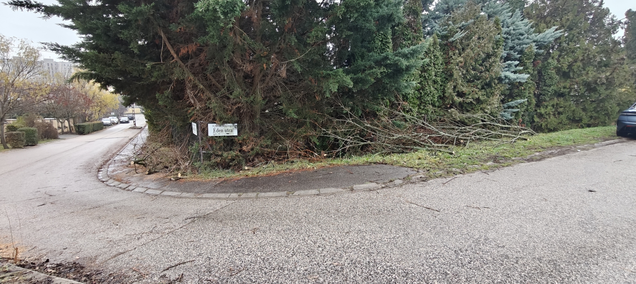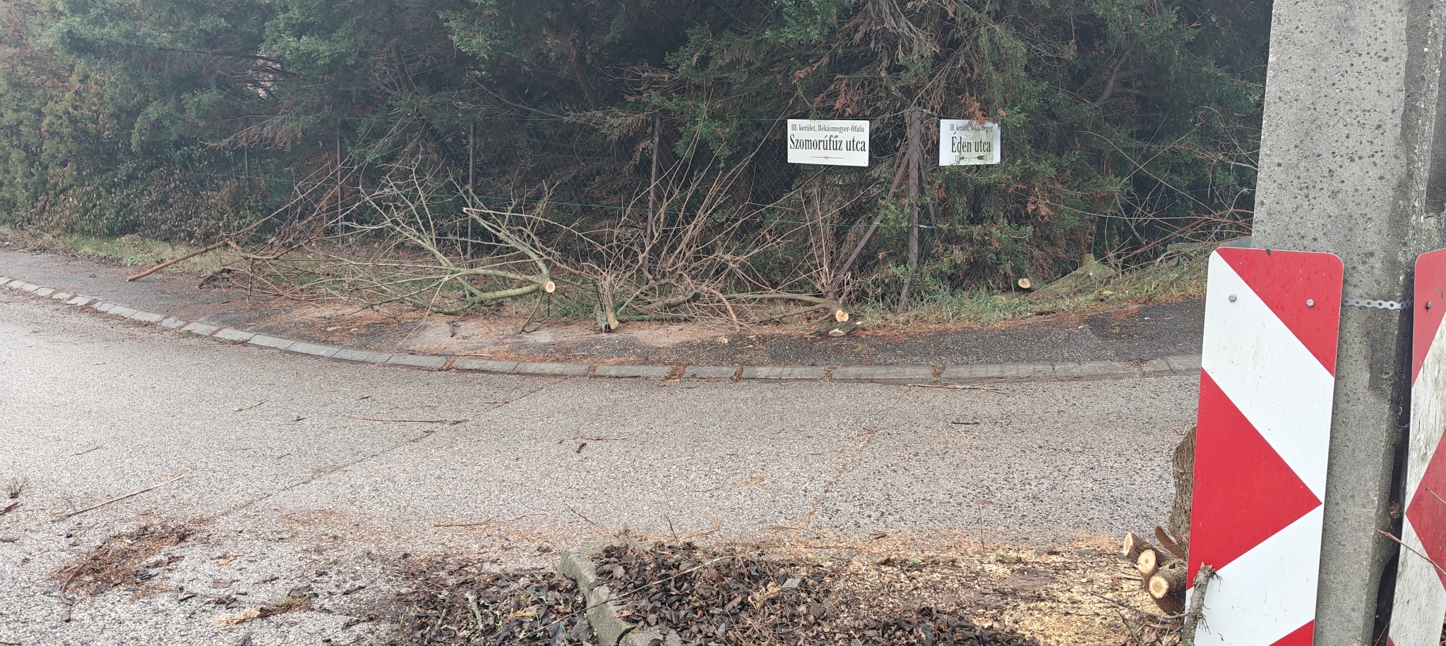 Az Éden utca és Szomorúfűz utca kereszteződésében a villanyoszlophoz nőtt bokrot valaki (talán ELMŰ?) 10 napja kivágta, de a levágott ágakat ott hagyta a járdán, út szélén.