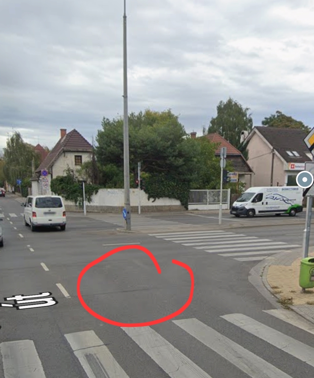 A csatolt képen nem látszik, mert korábbi street view kép, de azóta került oda egy csatornafedél, a. I mellett kátyú keletkezett.