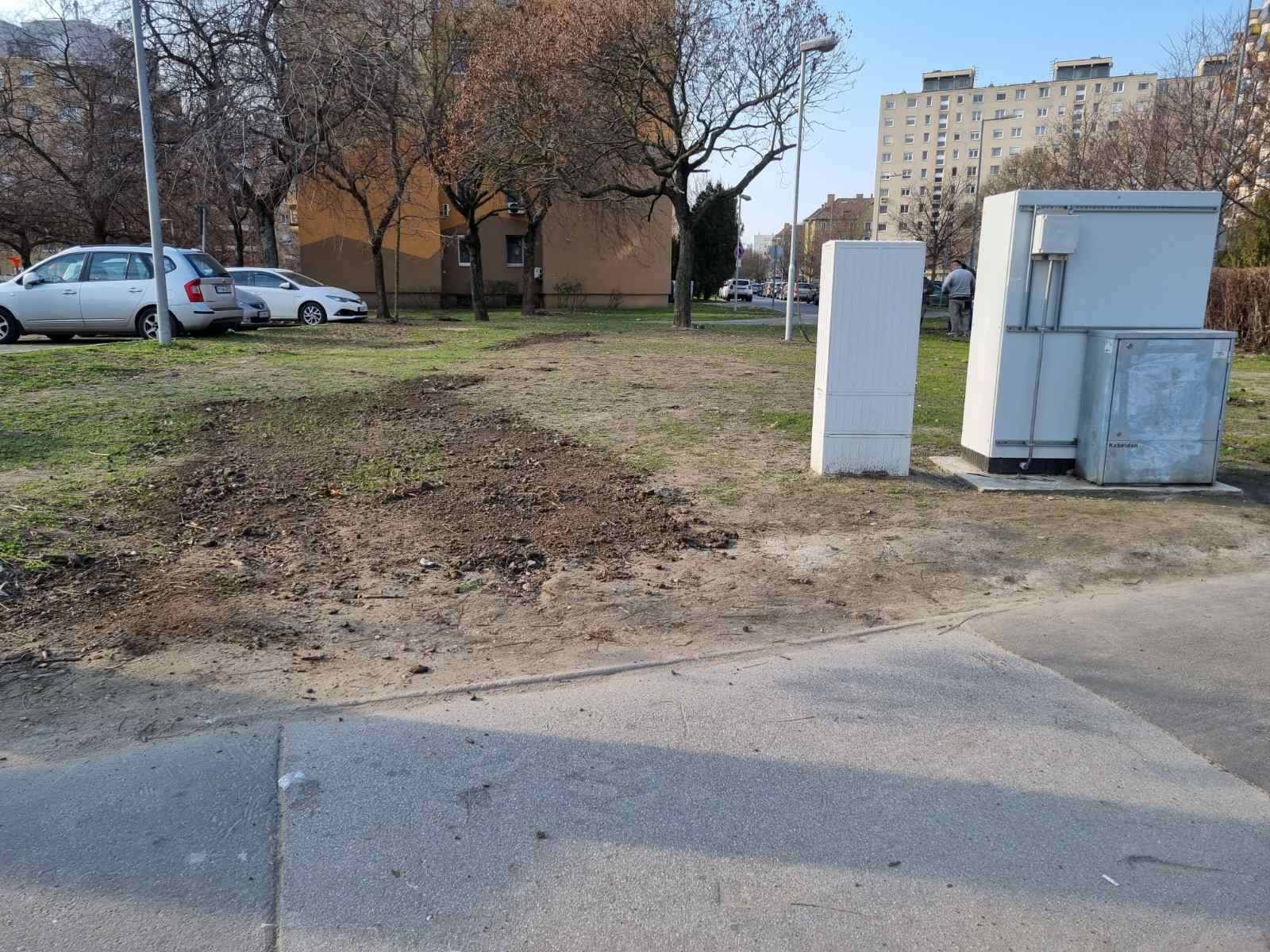 De a Somfa-köz szervízút felől is ráhajtottak a frissen rendezett terepre, a végeredmény látható a fotókon, minősíthetetlen, mielőbb helyre kell állítani a fűmag újraszórása mellett. Az egész környék 2 hónapja vastagon fedett száraz levelekkel, melyekben hegyekben áll a szemét és a kutyaürülék, úgy véljük, ez a közterületet karbantartó cég dolga lenne, de tavaly is egész télen otthagyták.