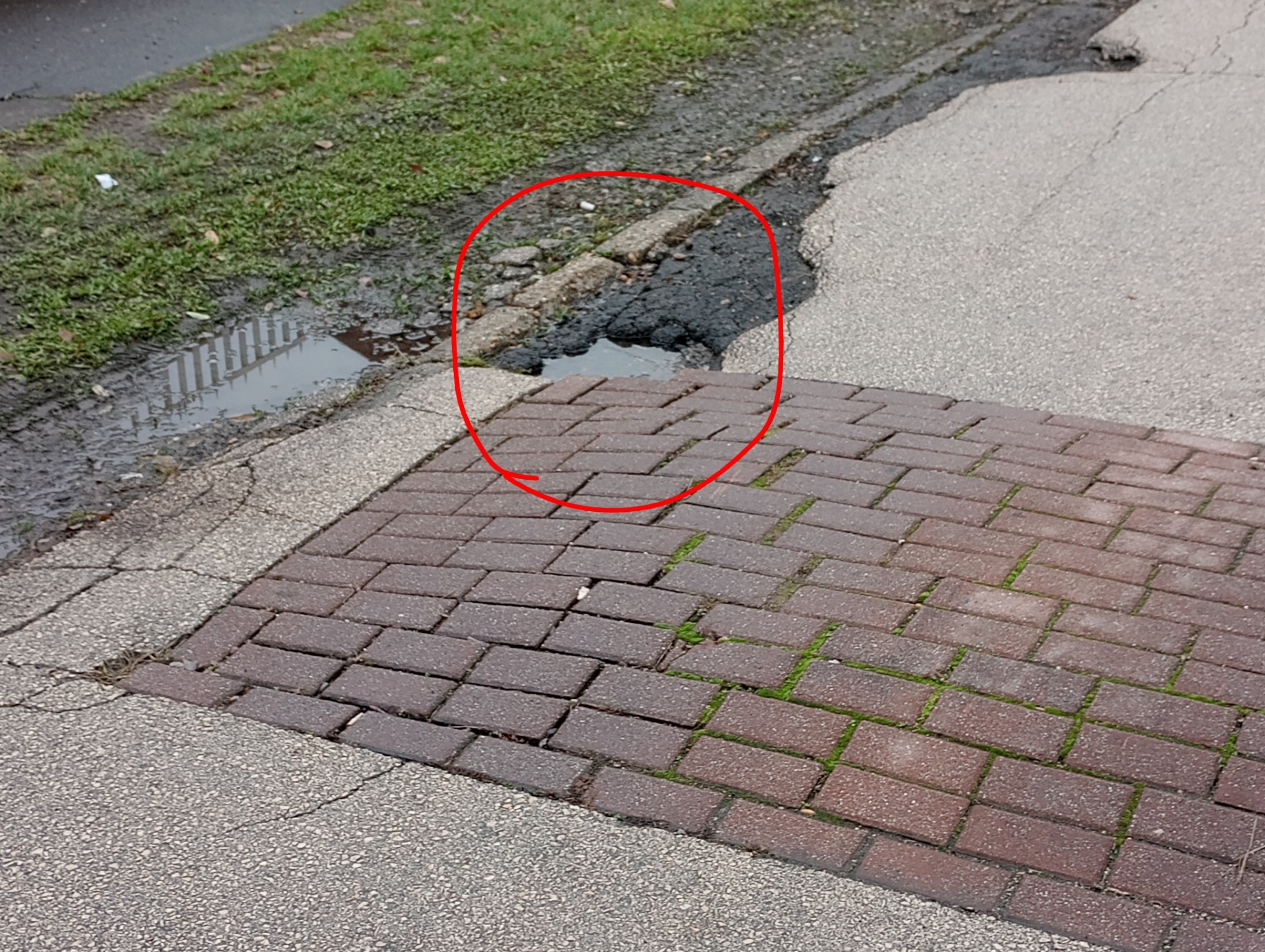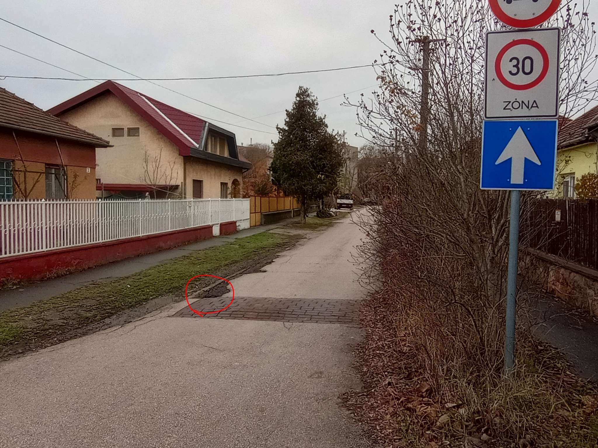 Csepelen a Fémmű utca elején a Szentmiklósi úttól nem messze, a színes kőből emelt fekvőrendőr szélénél az hiányzik egy darab az útburkolatból. Az egész korábbi javítás nincsen egy szintben az úttal.