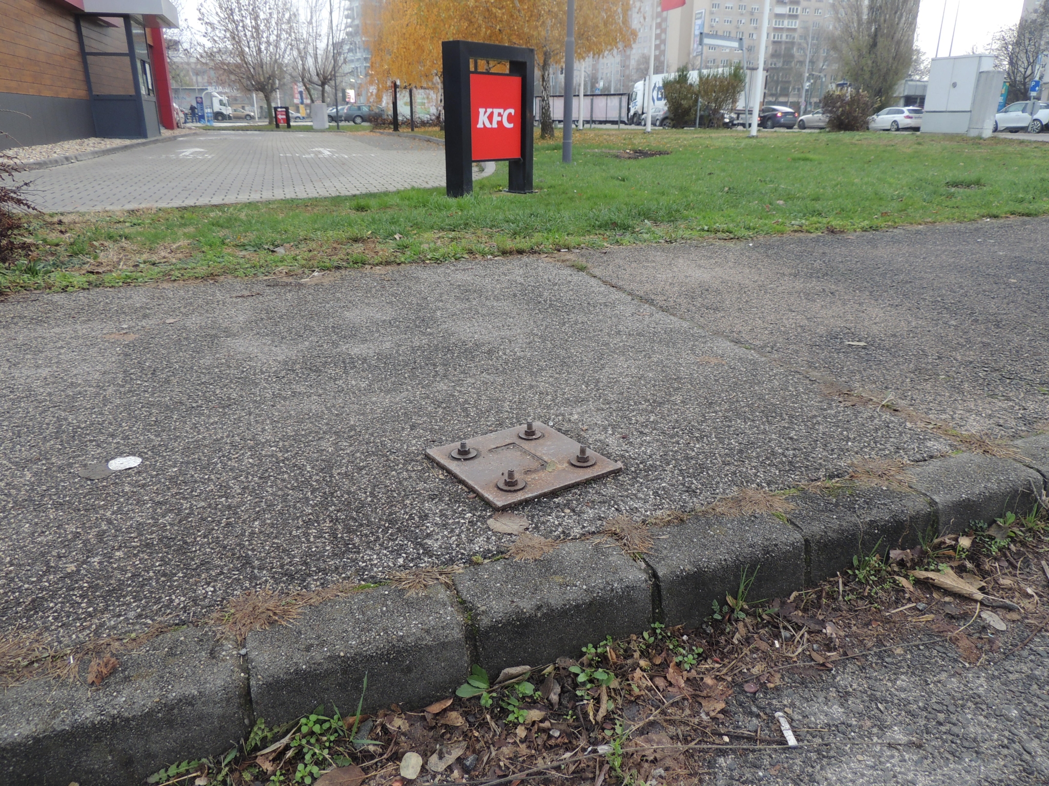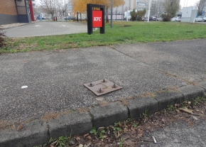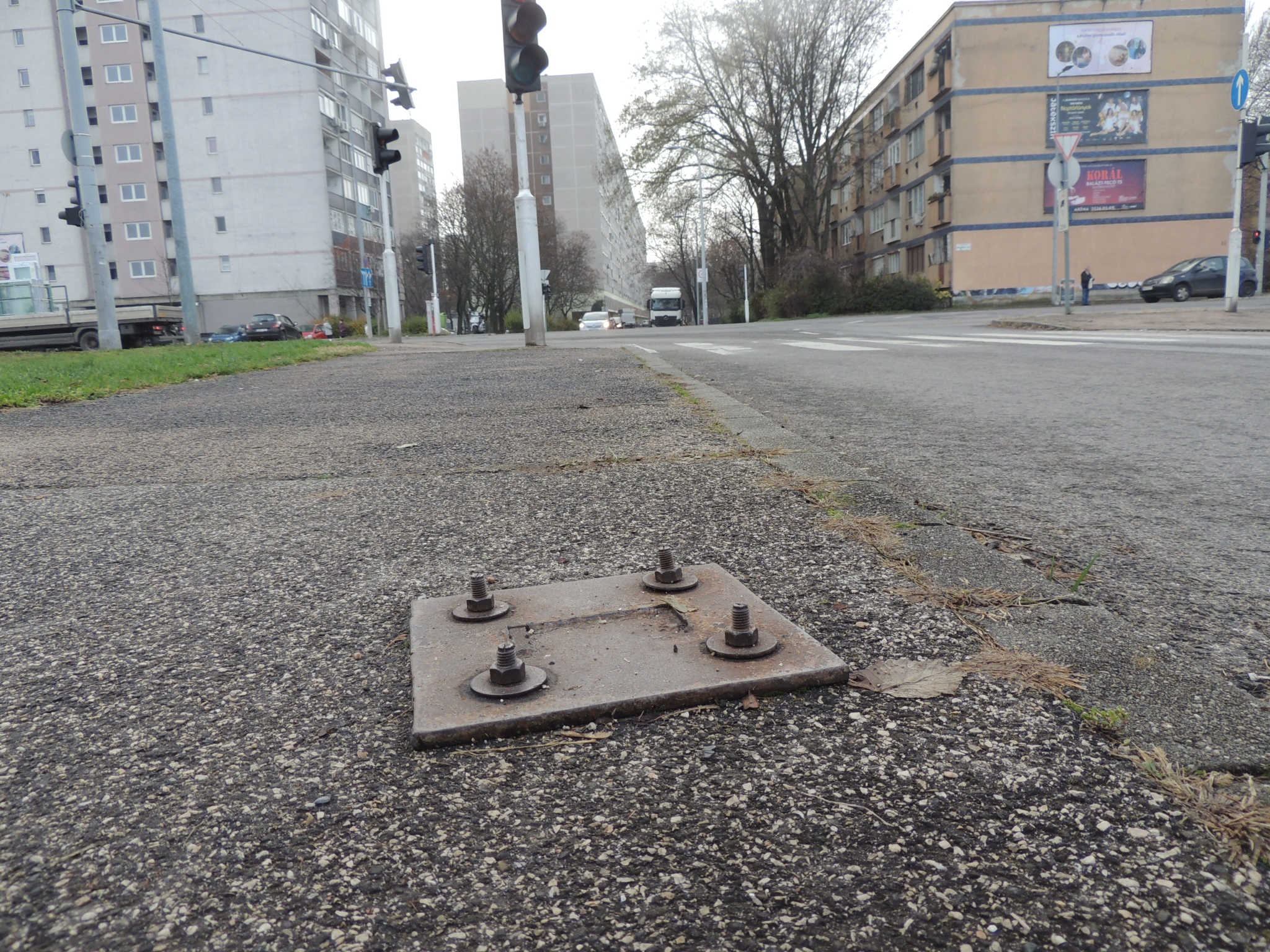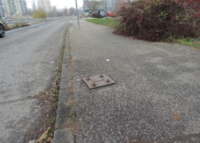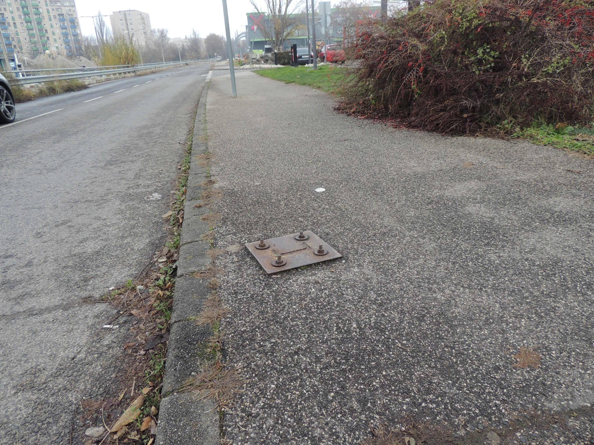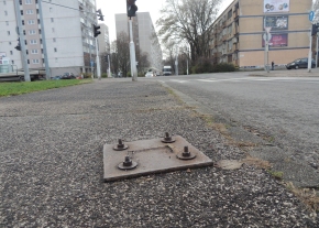 Budapest Bogdáni út és Mőmax járda kereszteződésnél kiálló csavarokba fel lehet botolni.