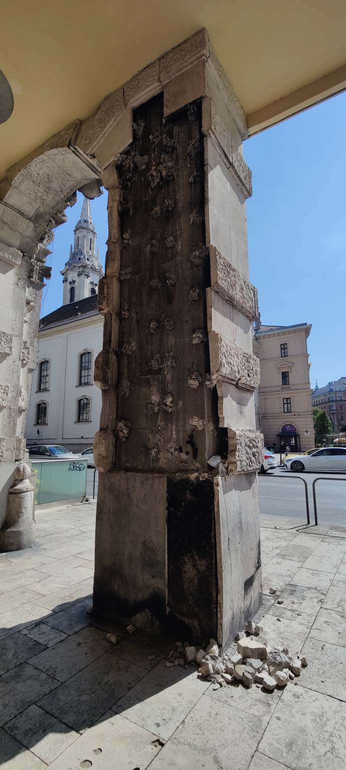 Ezúton szeretném bejelenteni, hogy a Ferenciek terén, pontosabban az 1053. Kossuth Lajos utca 2/a. házszám alatt található épület egyik árkádpillére súlyosan megrongálódott, állapota folyamatosan romlik, és jelenleg omladozó, balesetveszélyes.