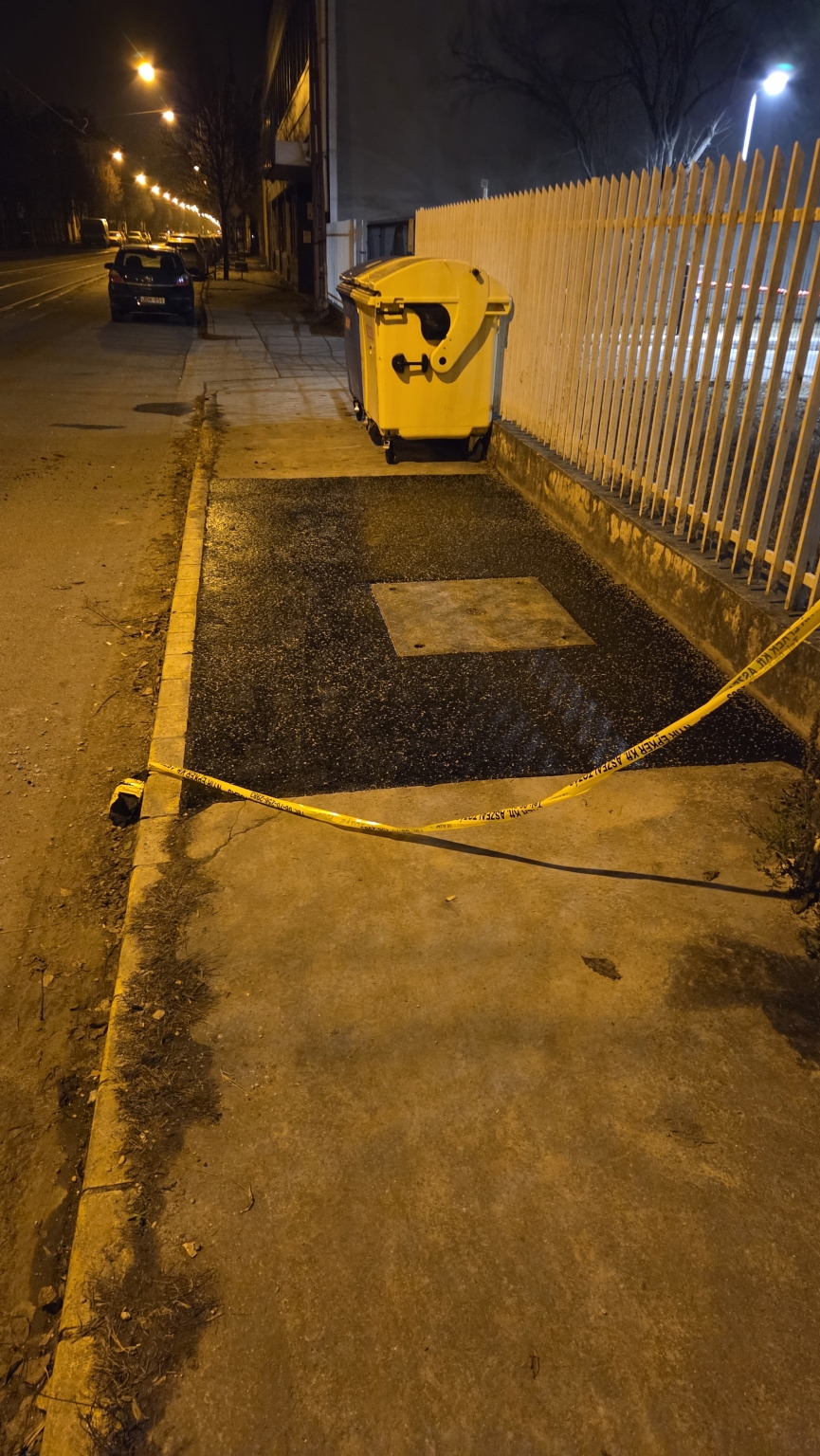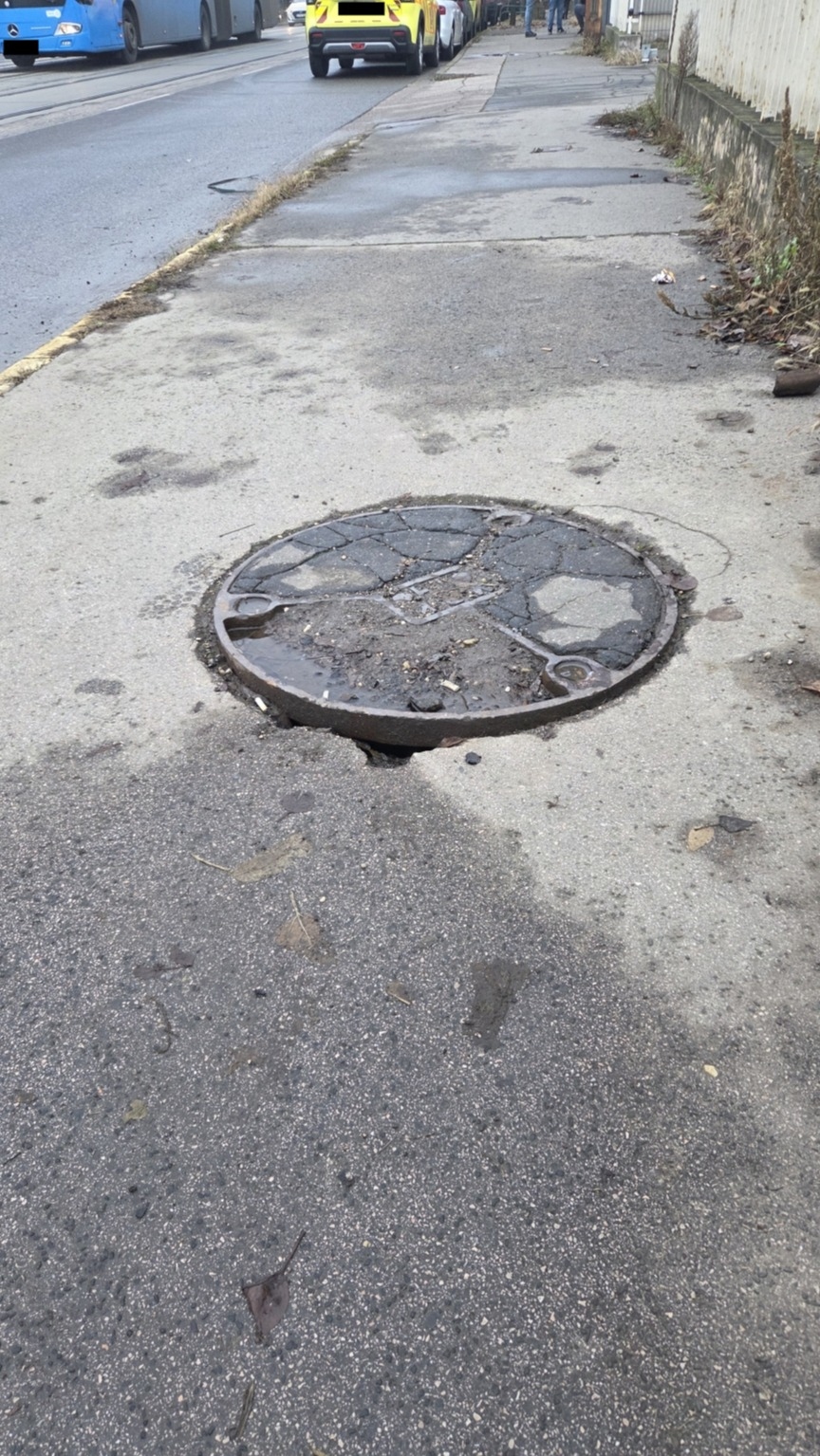 Távközlési aknafedő, ami balesteveszélyes, mióta felfeszítették. Magyar Telekom tulajdona.