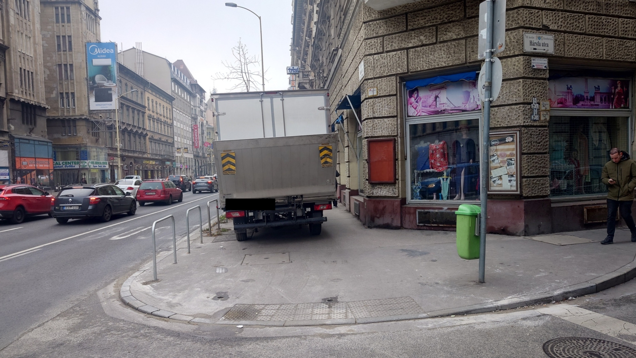 A Rákóczi út és a Hársfa uta kereszteződésében hiányoznak a parkolásgátló oszlopok, így az áruszállítók a járdára állnak.