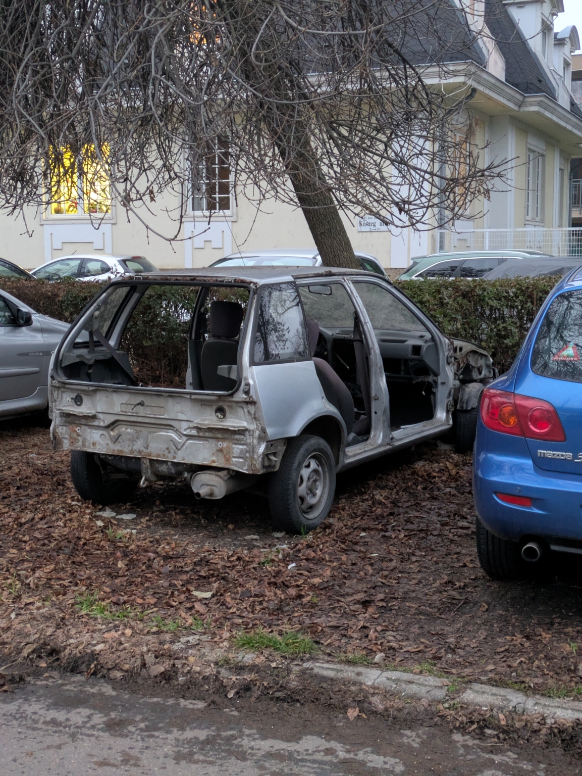 Roncsautó foglalja a helyet a Kőszeg utca 26 előtt.