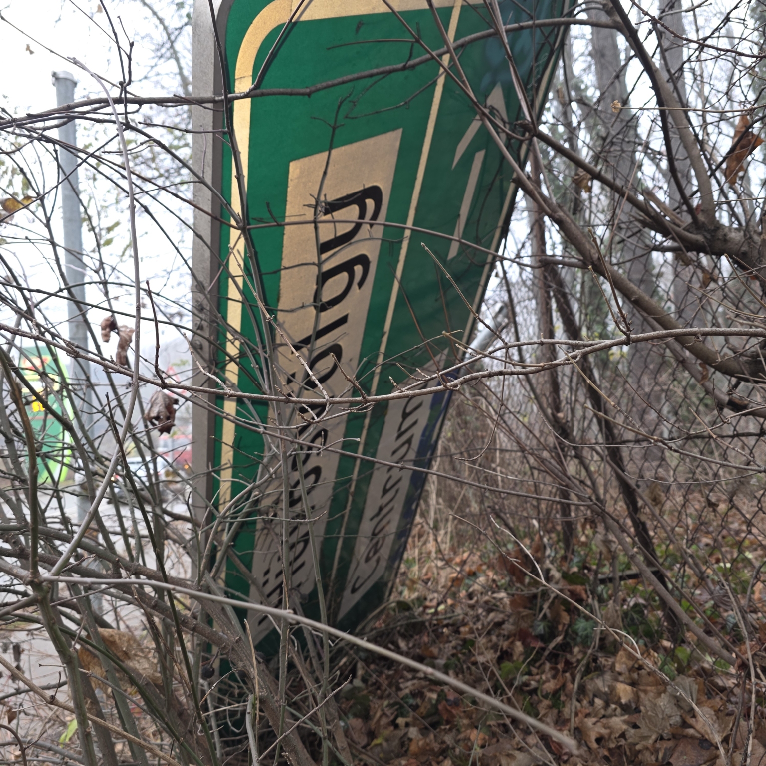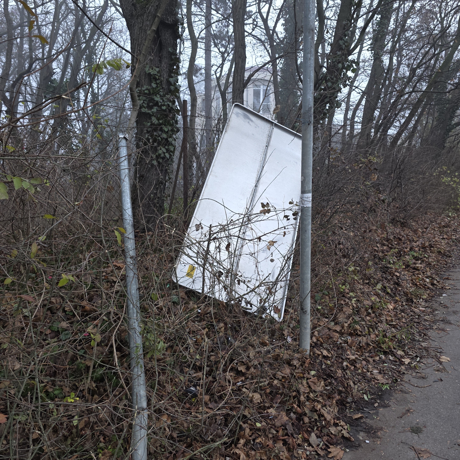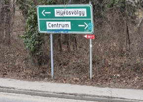 A II. ker. Hűvösvölgyi út 136. (MOL kút) előtt az út szélén a bokorba hajítva található egy kitört jelzőtábla.