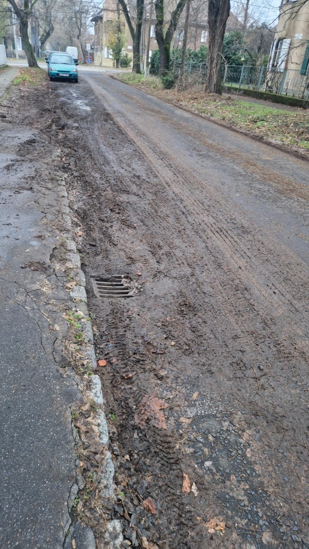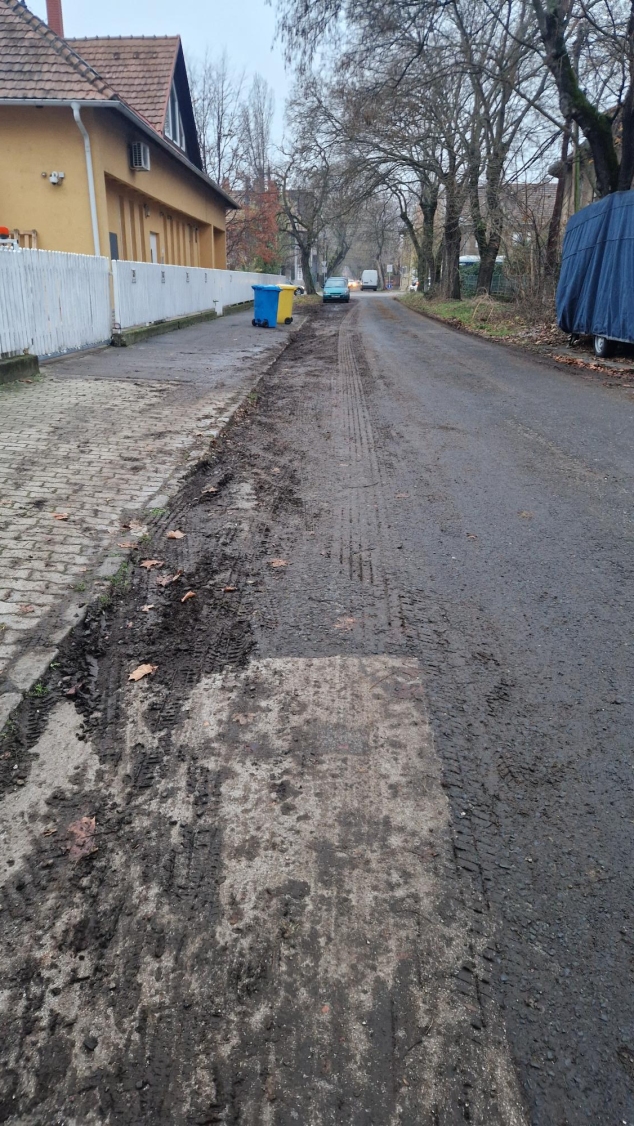 A XIX. kerületben, Wekerletelepen a Gellért utca 1.-5. előtti útszakaszon a rothadó levelek és az út szélén parkoló autók által az útfelületre hordott sár nagy mennyiségben borítja be az aszfaltot. Igyekszünk rendben tartani a környezetünket, de ezzel a mennyiséggel már nem bírunk.