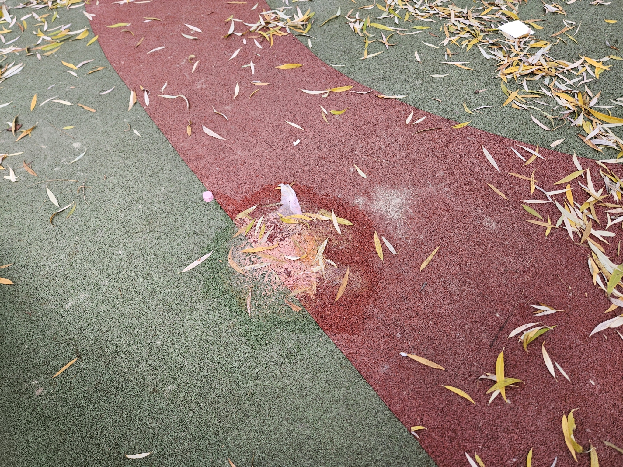 Gutenberg téri játszótéren a gyerekjátékok mellett össze van hányva a burkolat, mellette borosüveg