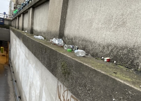 A Déli pályaudvar Alkotás utcai lejárójánál minden nap jelentős mennyiségű szemét halmozódik fel. A hulladék feltehetően felülről kerül ide, mivel a dohánybolt és az éjjel-nappali bejárata előtt is naponta hasonló típusú szemét gyűlik össze (kávékeverő pálcikák, cigarettacsikkek, alkoholos üvegek, energiaitalos dobozok, kupakok, cigarettásdobozok stb.). Emellett a vandalizmus is folyamatos: a burkolat egy helyen betört, a falakat pedig rendszeresen graffitik borítják.