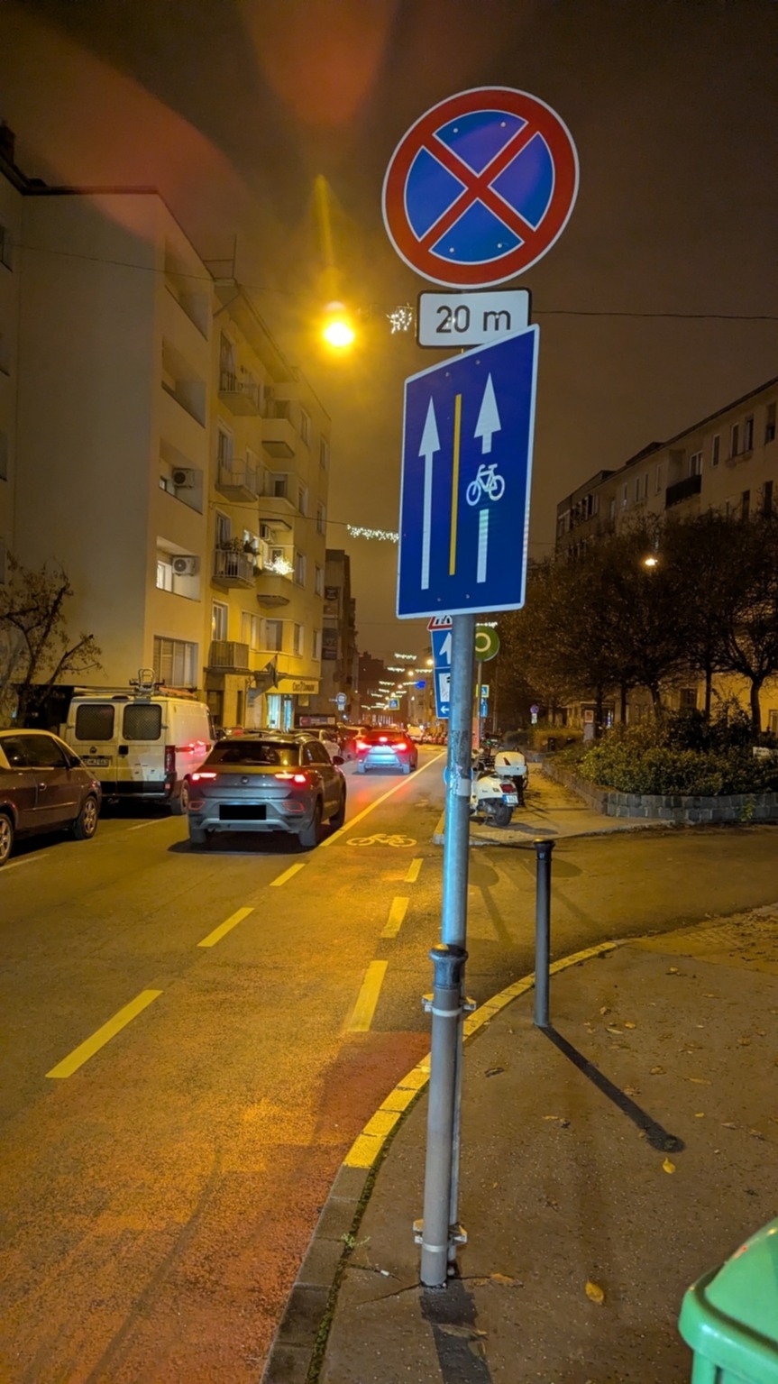 A megállni tilos tábla megtévesztő, mivel az oszlop elhelyezése alapján úgy tűnhet, hogy az egyenes irányra vonatkozik, de azt egyrészt feloldja a csatlakozó utca, másrészt azon kerékpársáv van, amire felesleges kitenni a táblát.