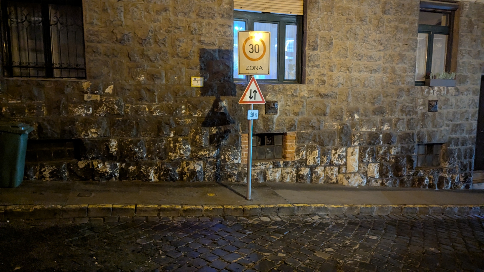A képen látható tábla nem jó helyen van és el is van fordulva.