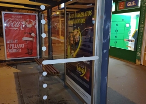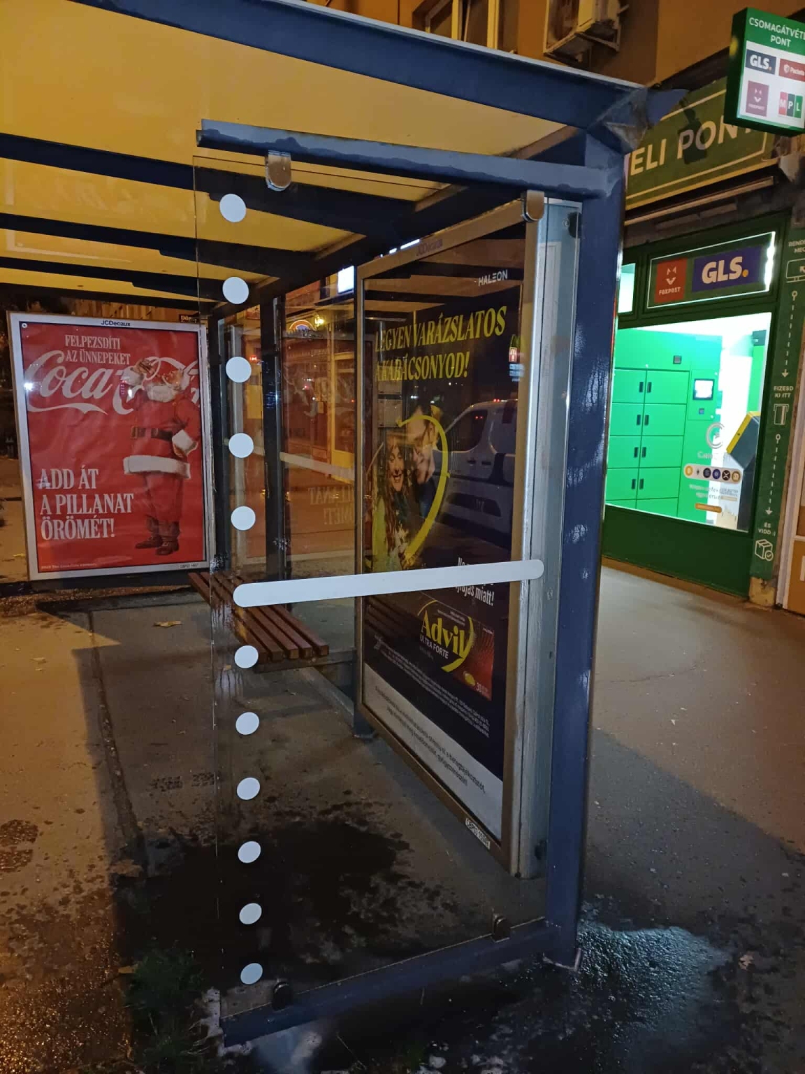 A Vörösvári úti buszmegálló üvege takarításra szorul. Továbbá a világítás is, villognak a neoncsövek.
