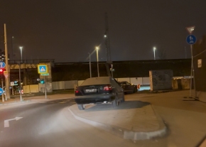 Járdaszigeten parkoló autó
