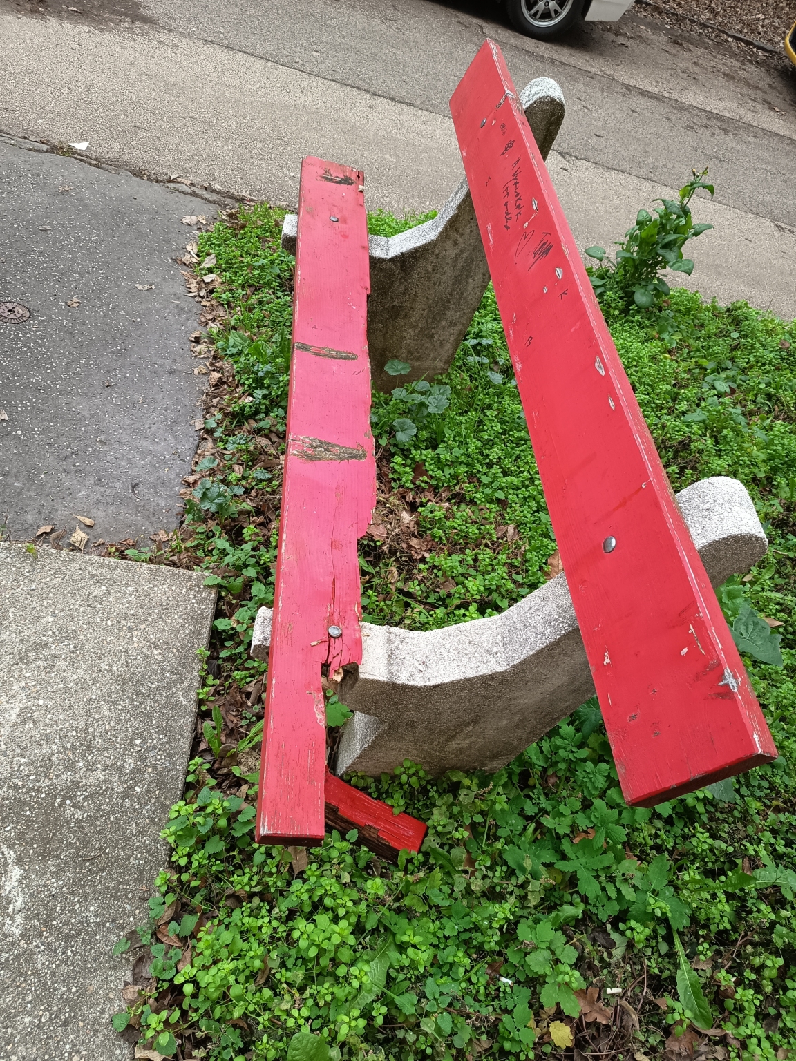 1184 Budapest Kézműves utca 14/C épület előtti pad ülő felülete eltörött, és korhadt, több darabja hiányzik.