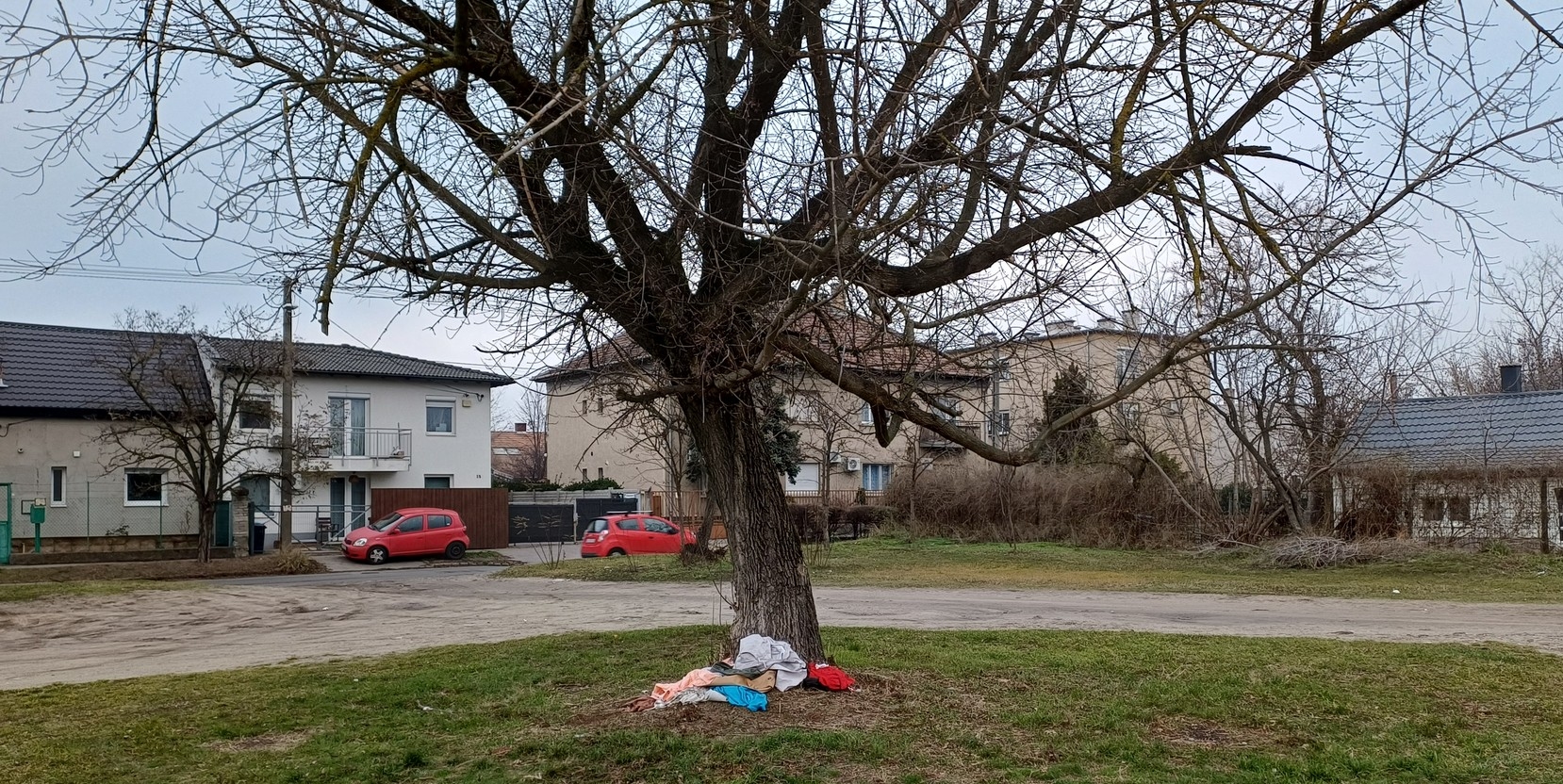 A nagy placcon lévő fa alatt szemétlerakás.