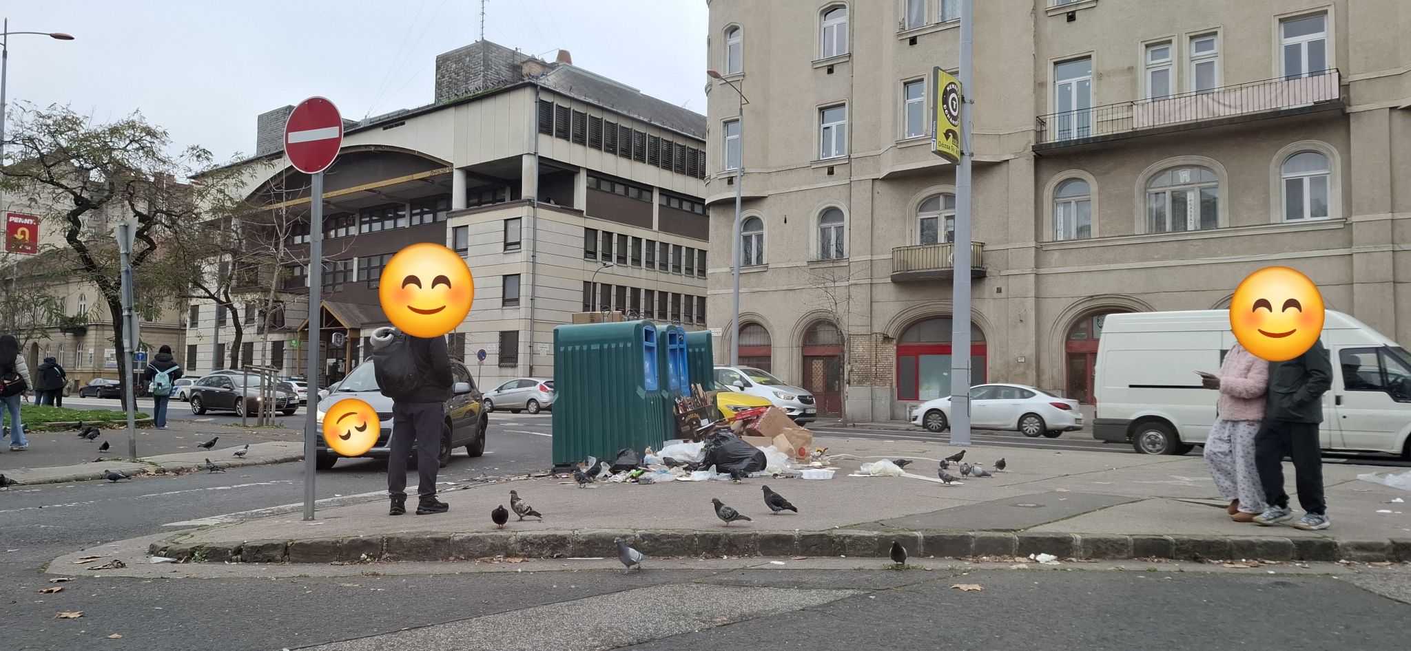 A Thököly út - Dózsa György út kereszteződésben lévő szelektív szigeten felhalmozták a szemetet,napok óta senki nem viszi el,csak gyűlik a kupac és ellepik a galambok. Ma épp turisták fotózták Budapest eme látványosságát, a szemétdombot.
