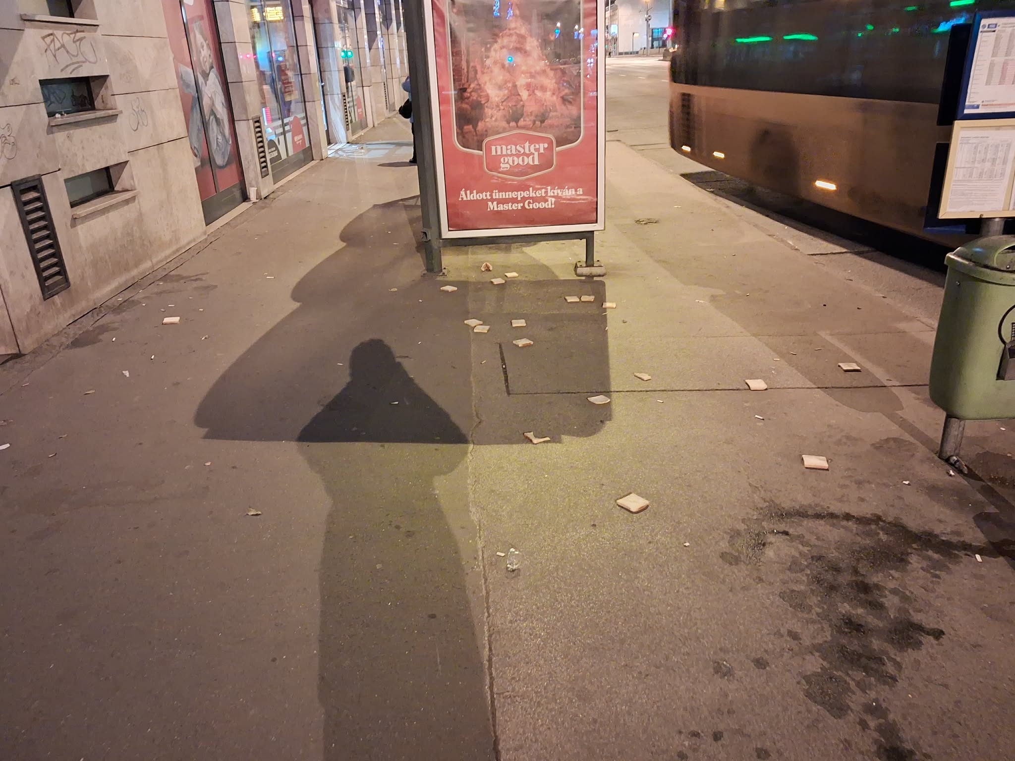 Újpest központ M autóbuszmegállóhely és annak környezete, a térképen is jelölt helyszínen kenyérdarabokkal?? van tele.