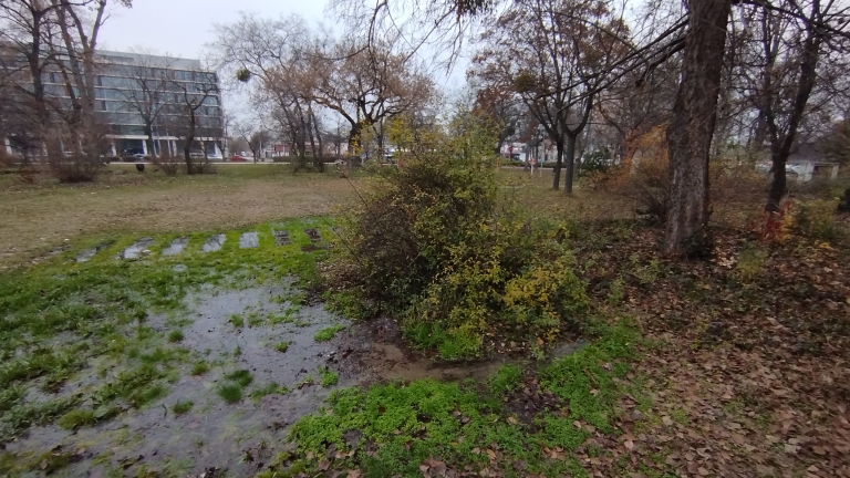 A Népliget egyik szakaszán folyamatosan ömlik a tiszta víz. Az nem látszik, hogy honnan jön a víz, de a környéken már szinte egy nagyobb pocsolya keletkezett. A víznek utánpótlása van, a víz szemmel láthatóan erősen áramlik.