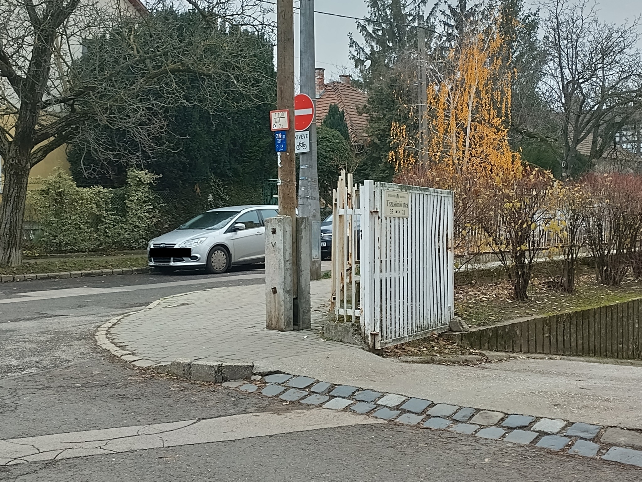 A kapura tették az utcanév táblát, ami ha nyitva van, megtévesztő lehet. Azt lehet hinni, hogy a keresztutcát jelöli.