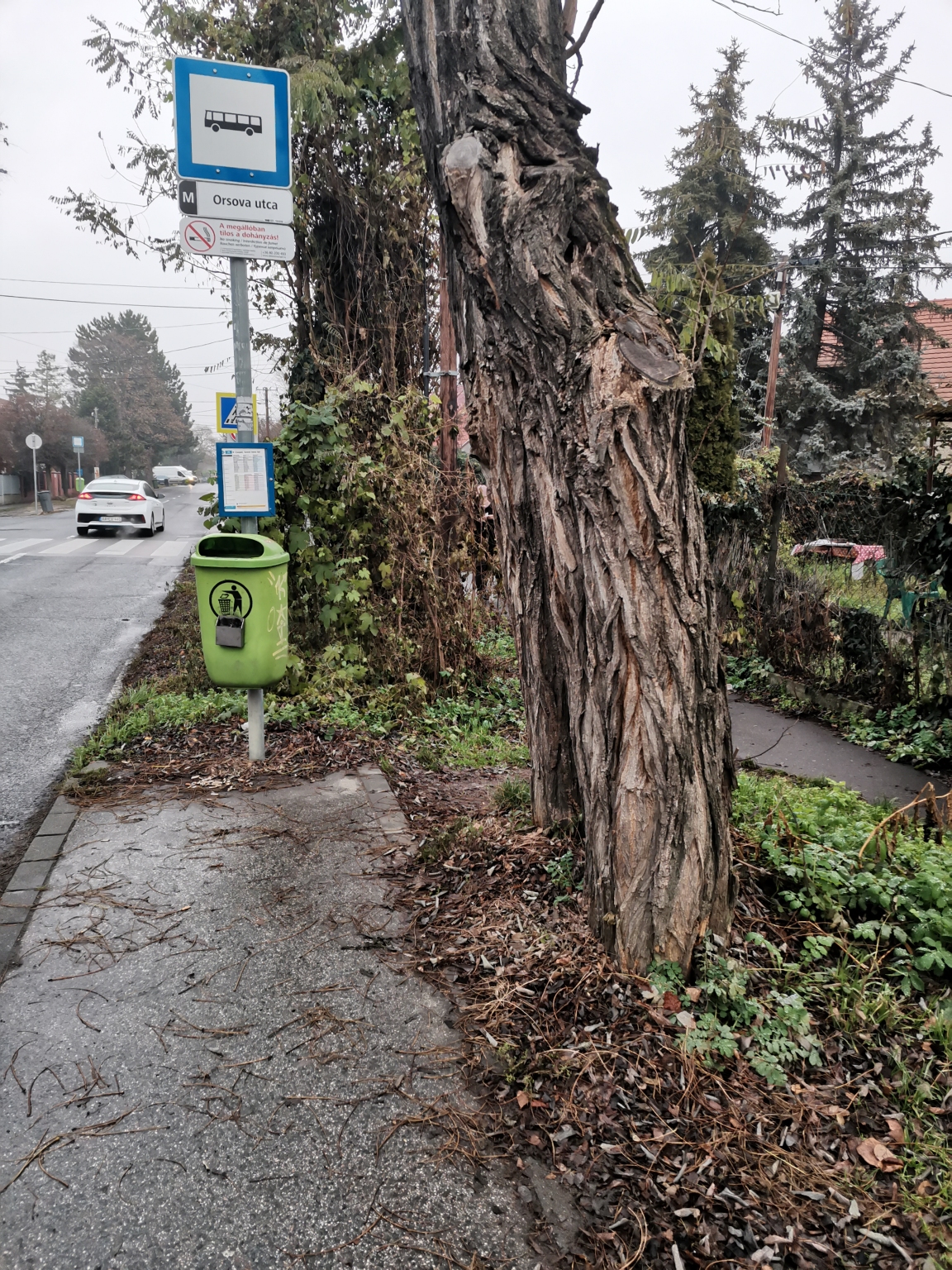 Csepelen 71 busz Orsova utcai megálló és a jarda piszkos és elhanyagolt. Idősek csúsznak meg a nedves leveleken.