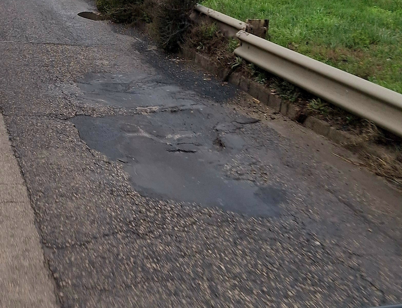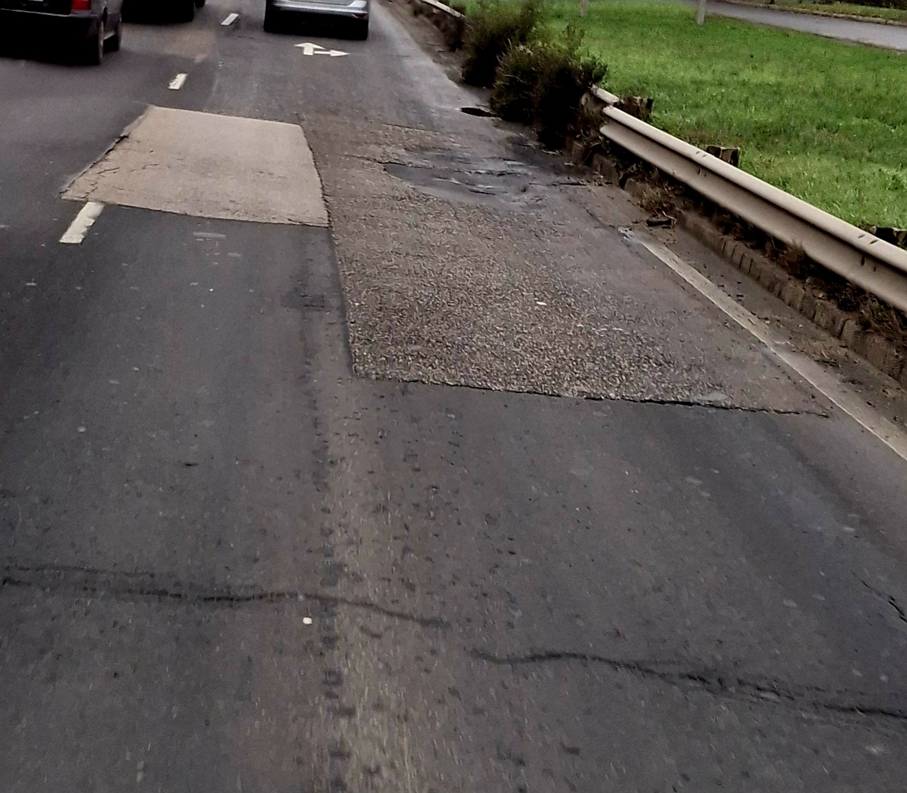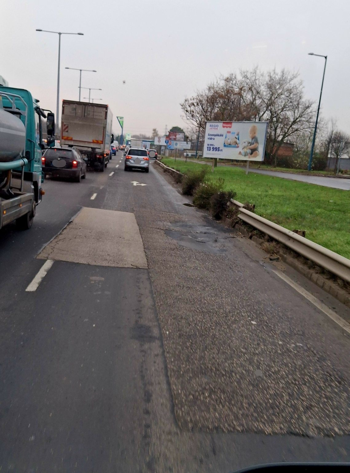 M3 bevezető szakaszon Körvasút felüljáró Zuglói oldalán kátyú a külső sávba.