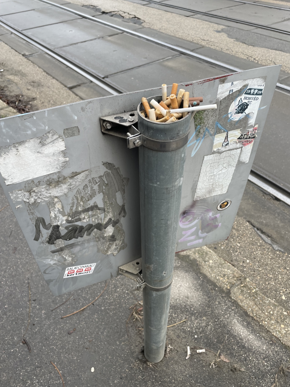 A 2. kerület Vadaskerti u-i villamosmegállóban (Hűvösvölgy felé), néhàny dohányos az oszlopokat használja csikktartónak. Jó lenne valahogy lefedni az oszlopok tetejét, mert a csikkek természetesen sokszor a járdán végzik