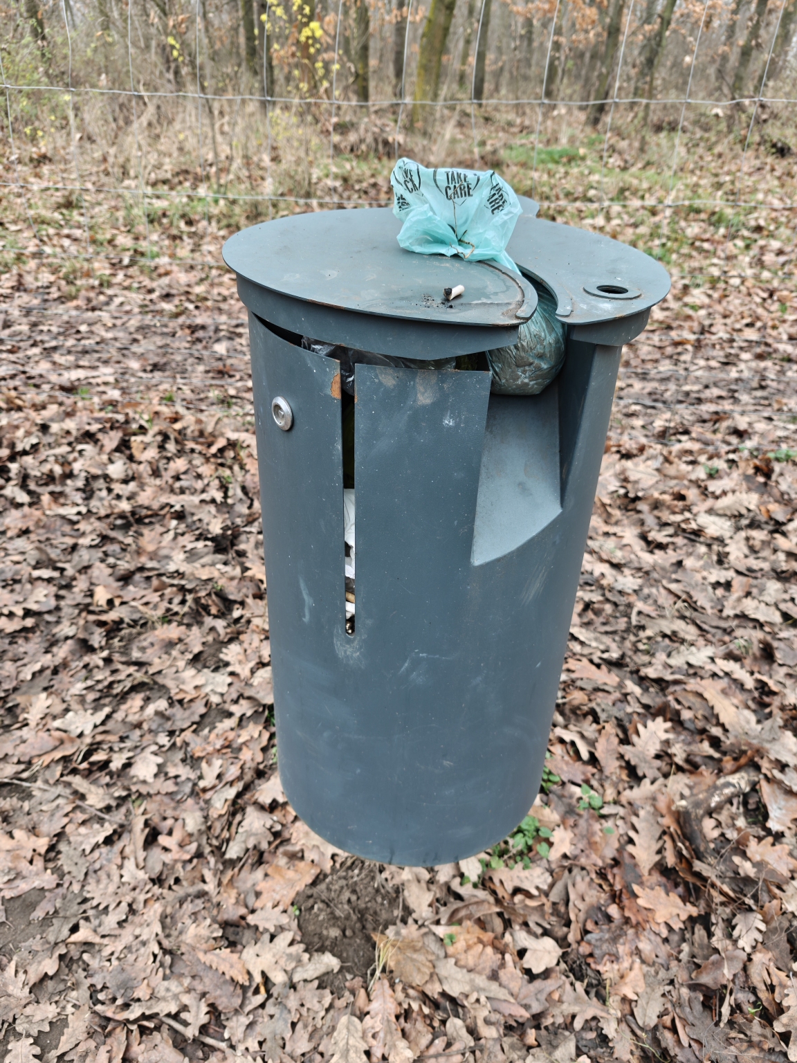 A pesterzsébeti Újtelepi-parkerdőben a kutyaiskola melletti kutyafuttatóban tele a kutyapiszok gyűjtő kuka.
