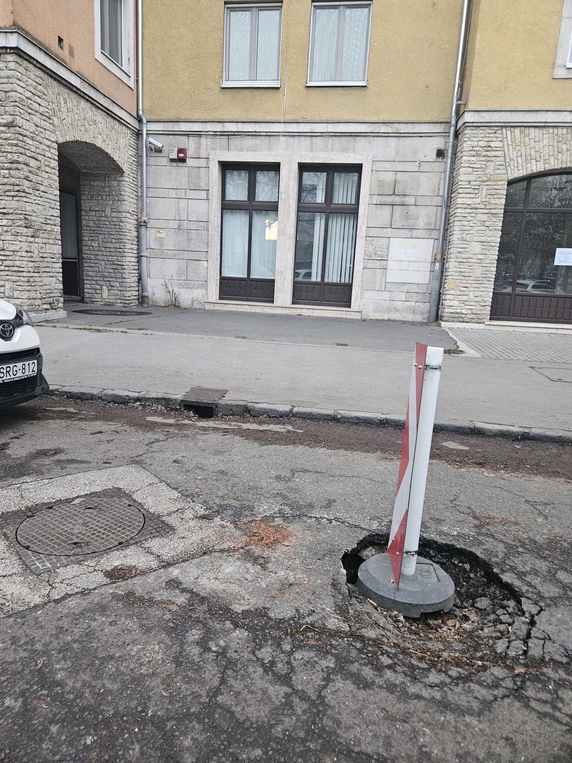 Lassan műemlékké váló útbeszakadás az Örs vezér tere 1. szám előtt. Hetek óta így van, balesetveszélyes. Zuglónak és FCSM-nek bejelentve, egyikük sem válaszolt.