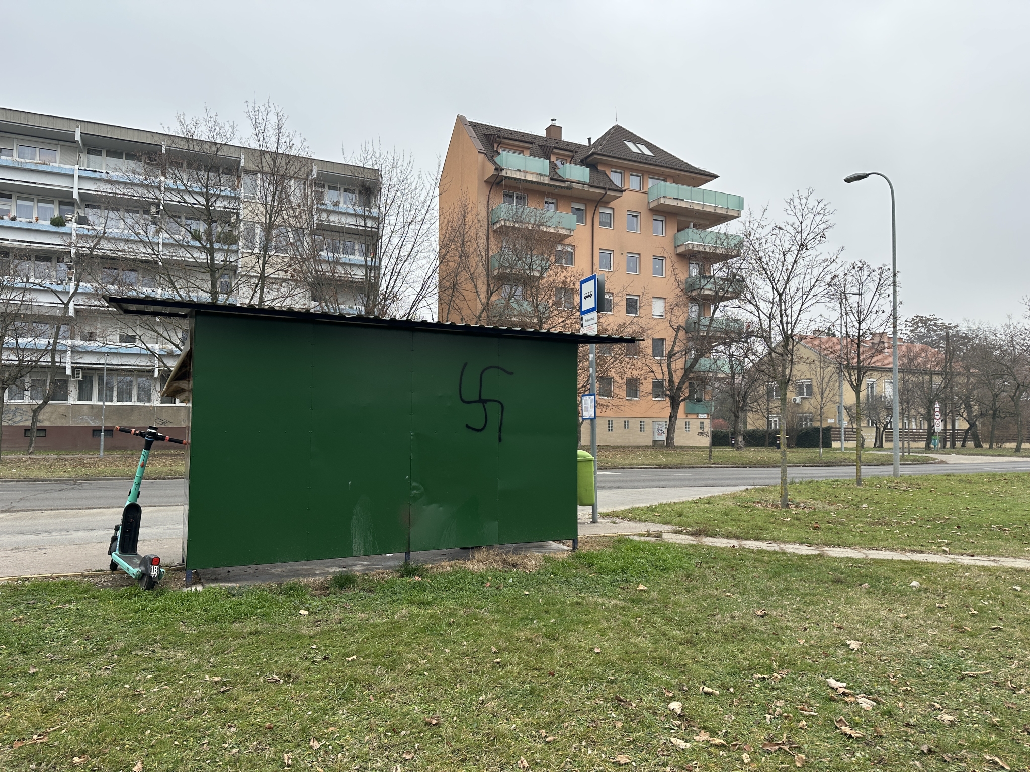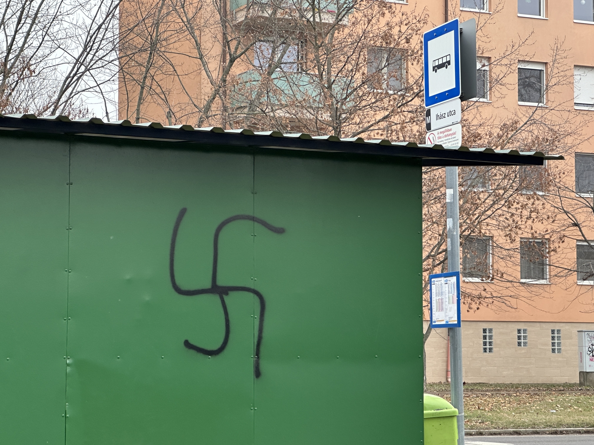 Náci jelkép firkálva a buszmegálló hátuljára.
