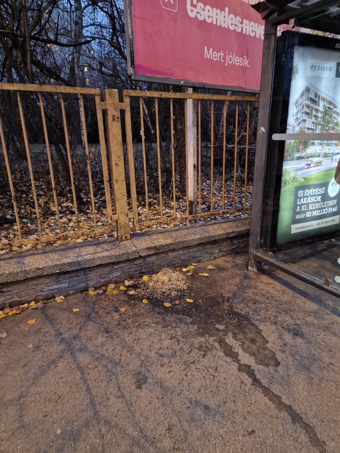 A Budaörsi út 99-nél hányás a buszmegállóban.