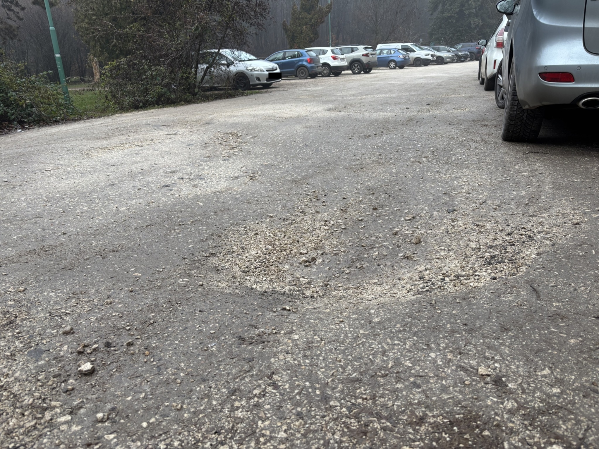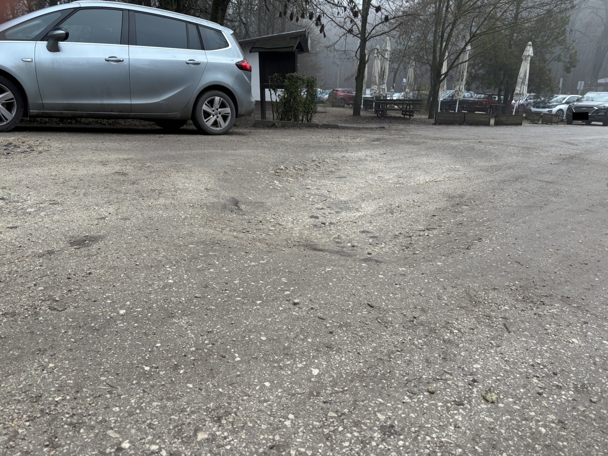 Poros kőzúzalékkal van ez a parkoló feltöltve, a kijárt kátyúkat is poros kőzúzalékkal lehetne feltölteni.