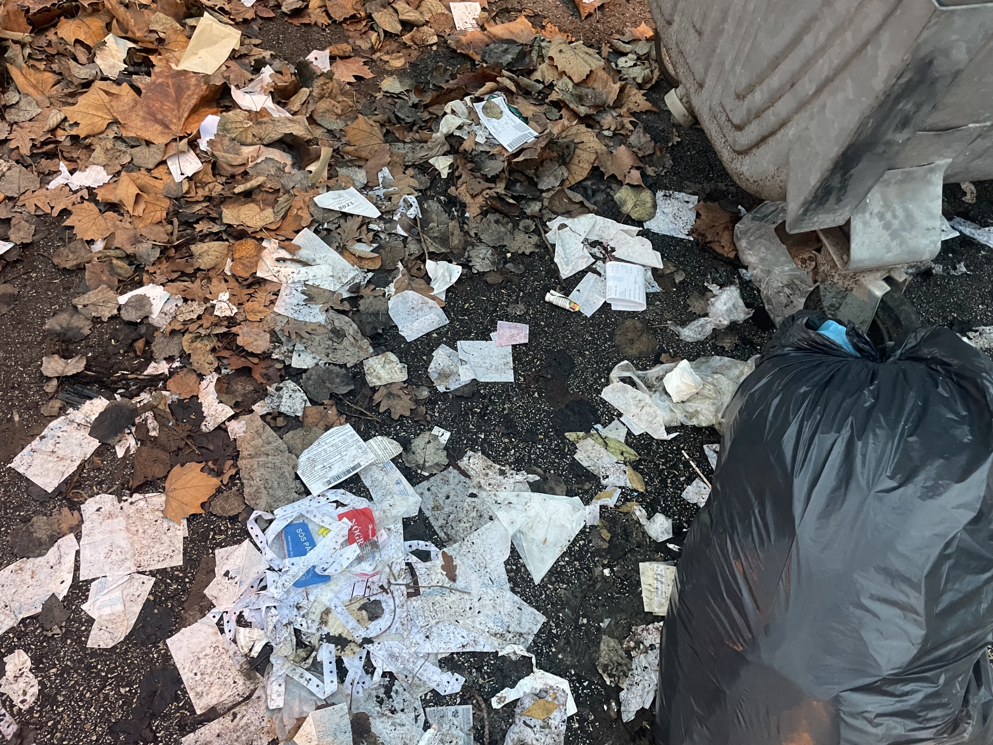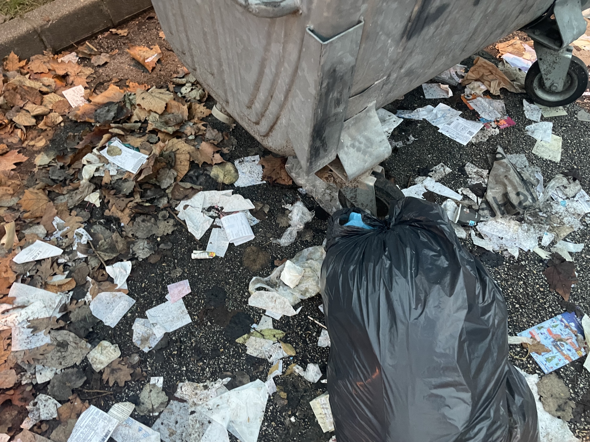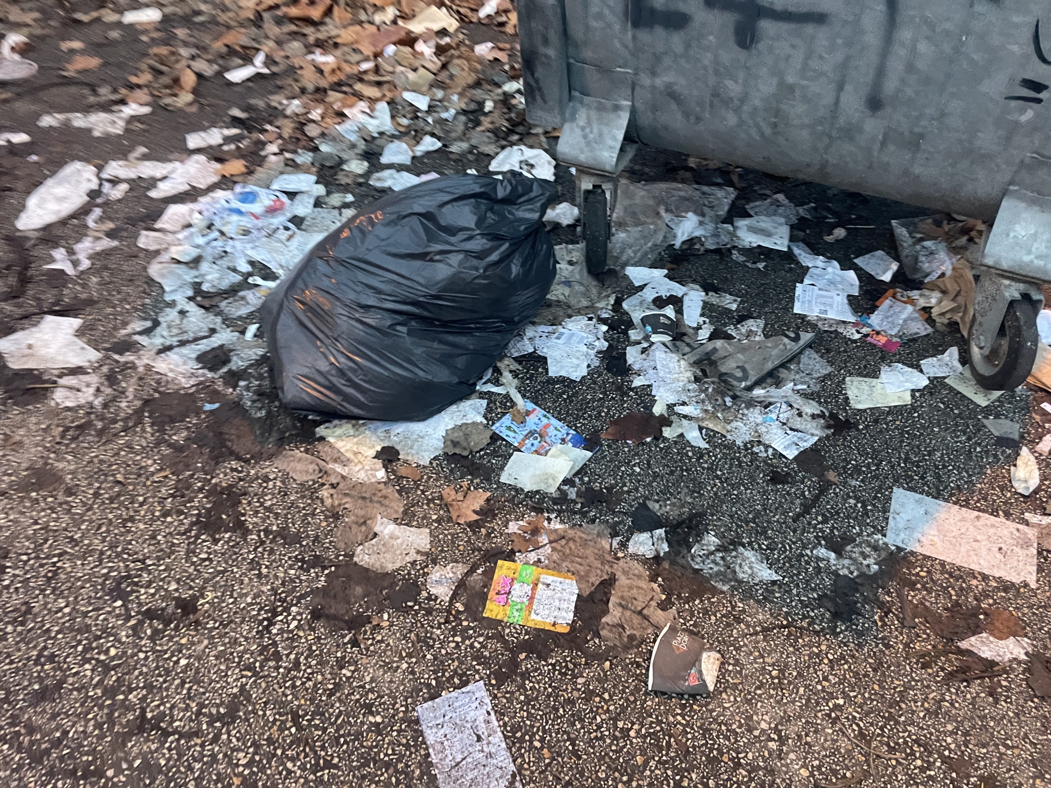 Állandóan ki van szórva a szemét, látszik hogy a Posta szemete mert sorszámcetli, csekk, blokkok és egyéb postai iratok vannak benne.