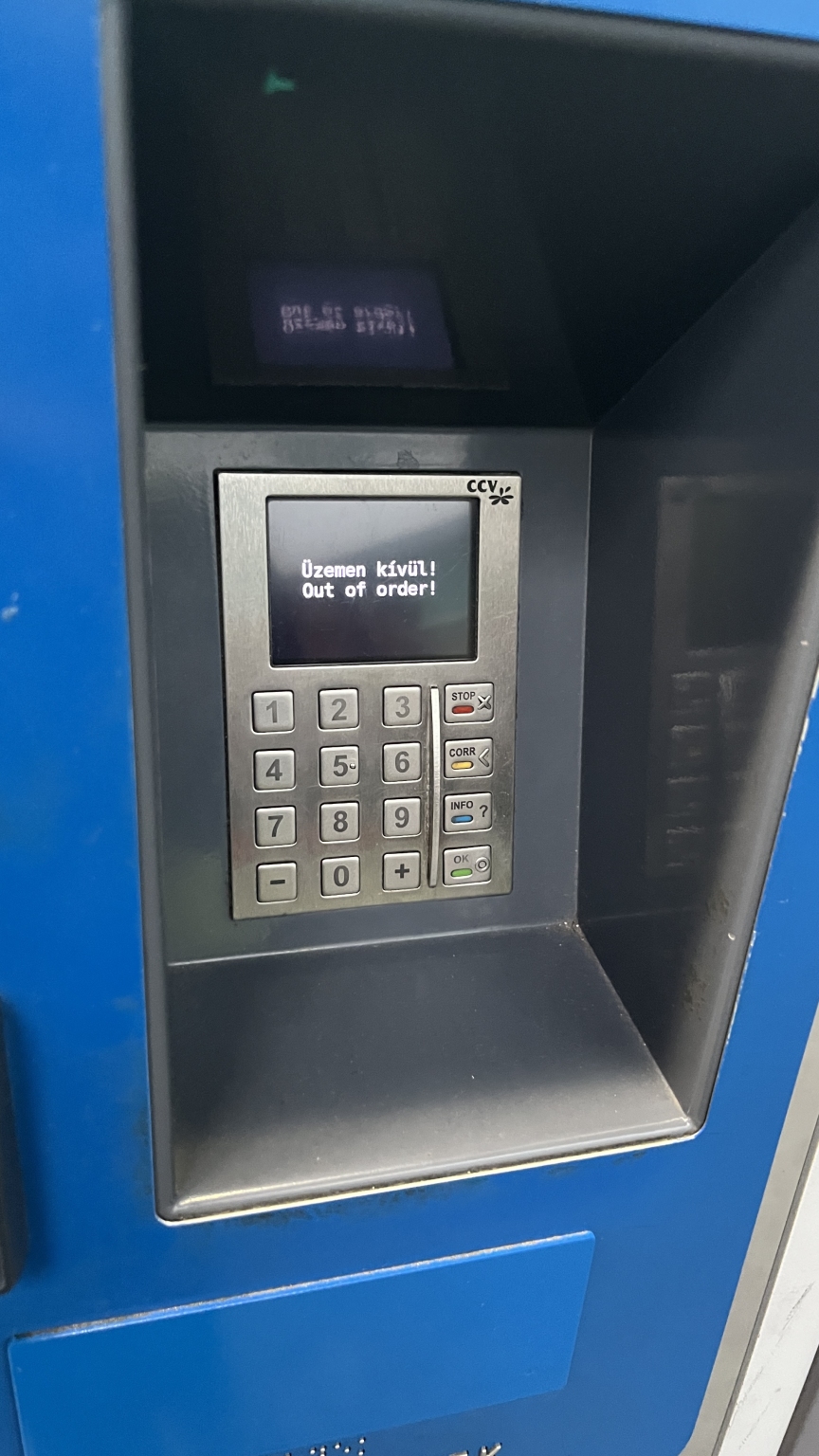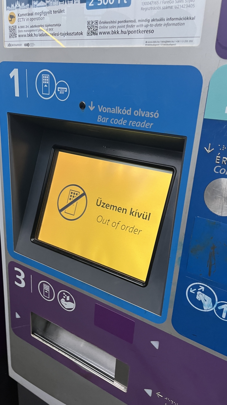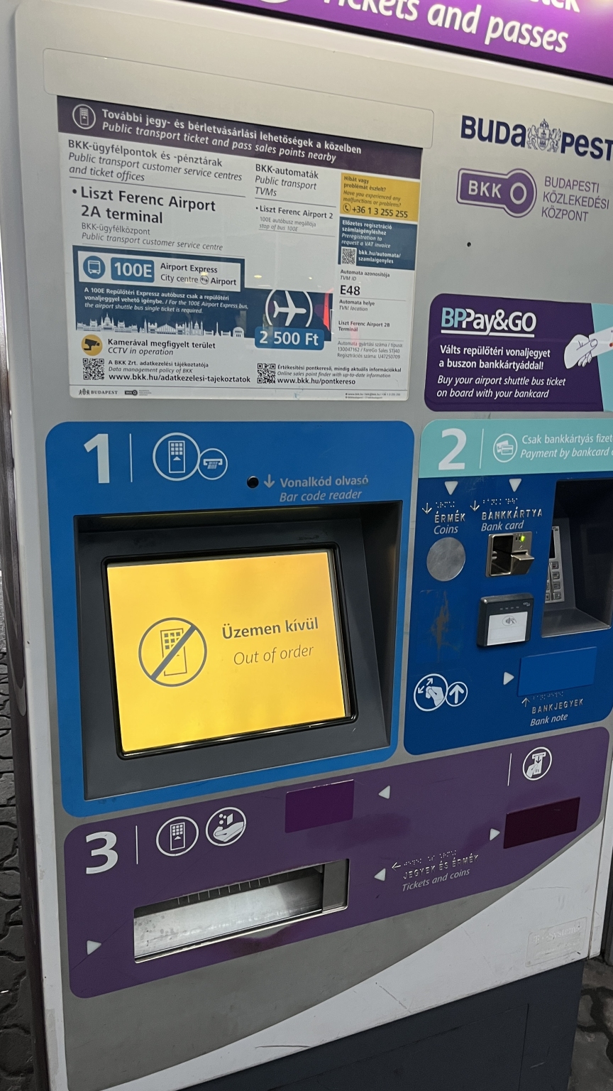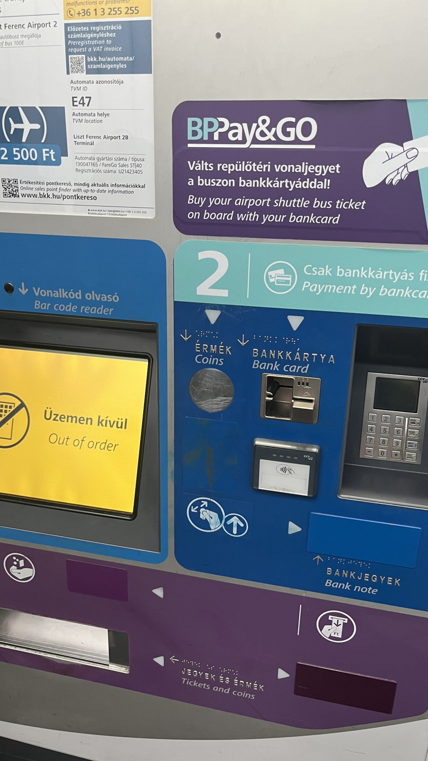 A reptéren a 2Bben 4-ből 3 jegyárúsító automata nem működik, kilométeres sor áll. Legyenek kedvesek normálisan üzemben tartani az aztomatákat, mert ez nem állapot, hogy ahányszor hazajövök ebbe a városba, az automatak nagy része nem működik. Van itt egy BKKs srác próbálja pörgetni, ő láthatóan megszakad.