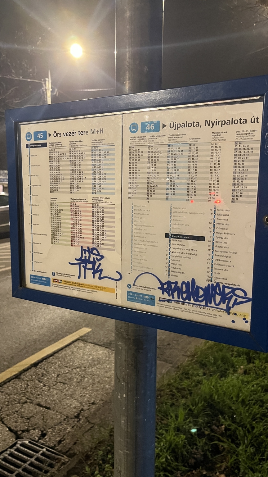 A 45-ös busz Diósy Lajos utca megállójában összetagelték a menetrendeket. Kérem az illetékest a tábla letisztítására. Köszönöm!