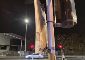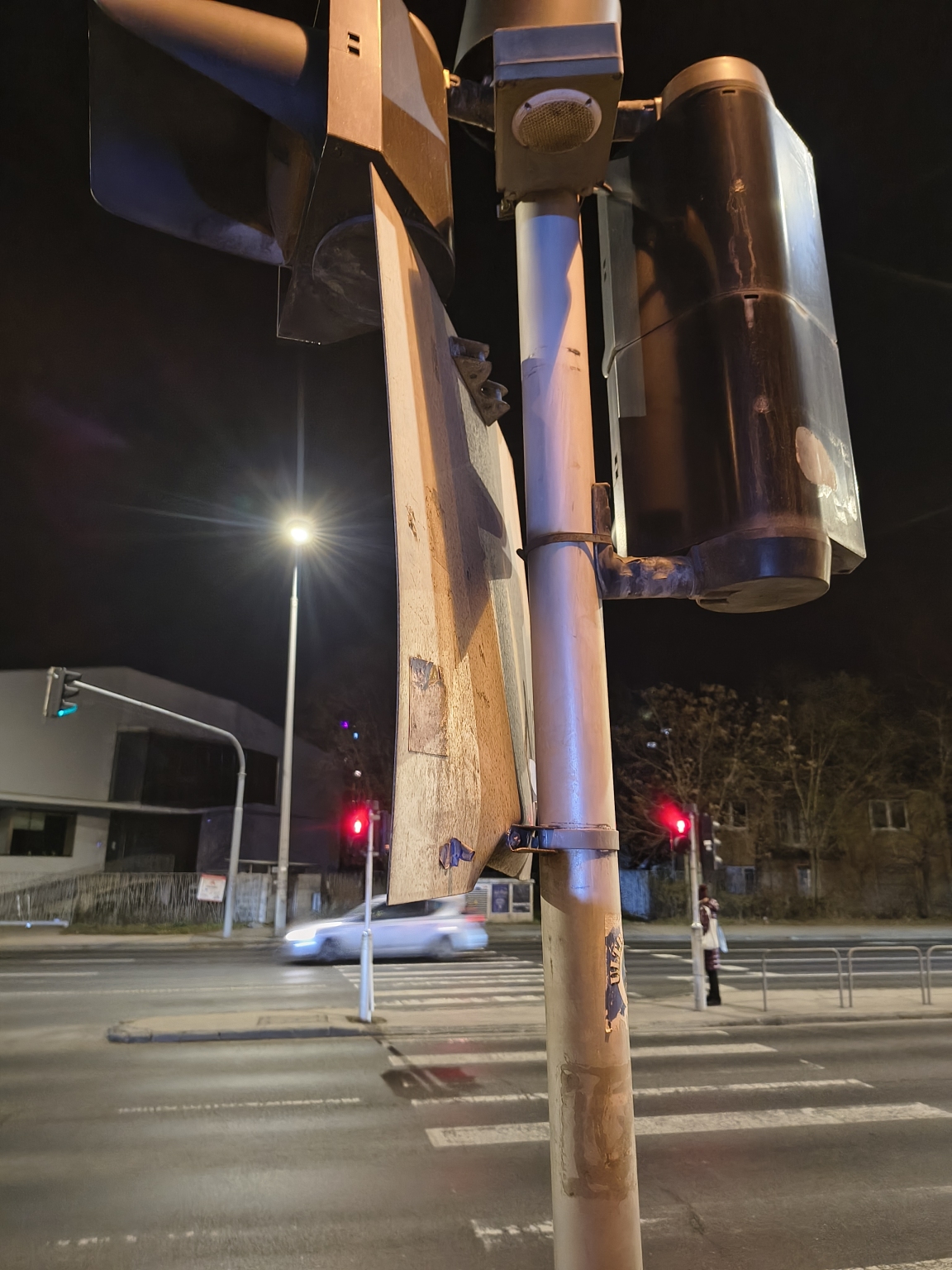 A gyalogos-átkelőhelyet jelző tábla elhajlott vagy megrongálódott