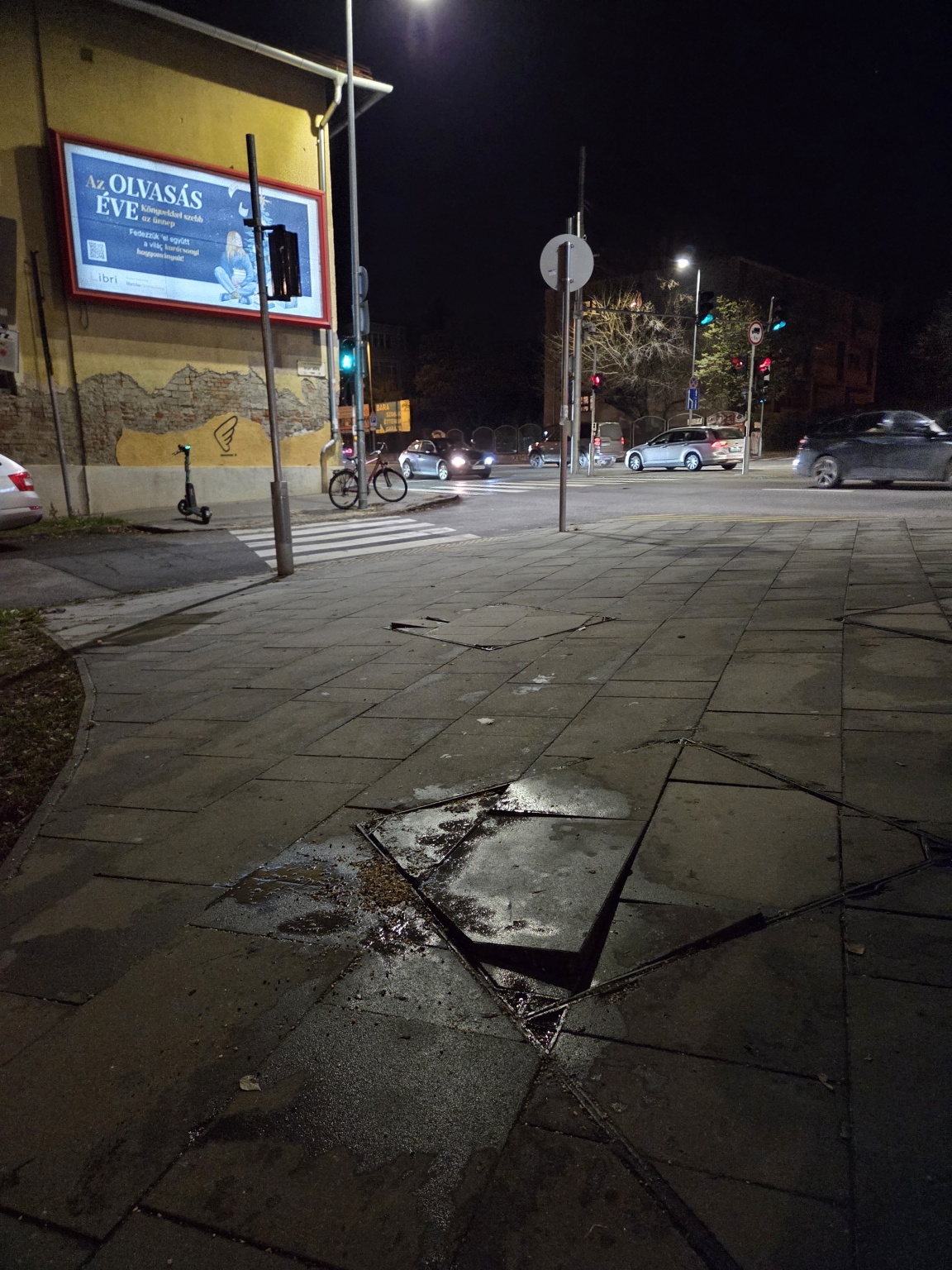 A Csörsz parkon átvezető sétány Hegyalja út felőli végén egy fedlap egyik burkoló köve billeg. Ez azon túl, hogy botlásveszélyes, a benne megálló vizet kifröcsköli a járókelők lábaira.